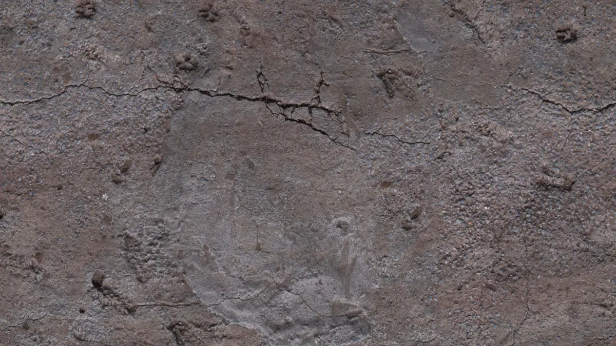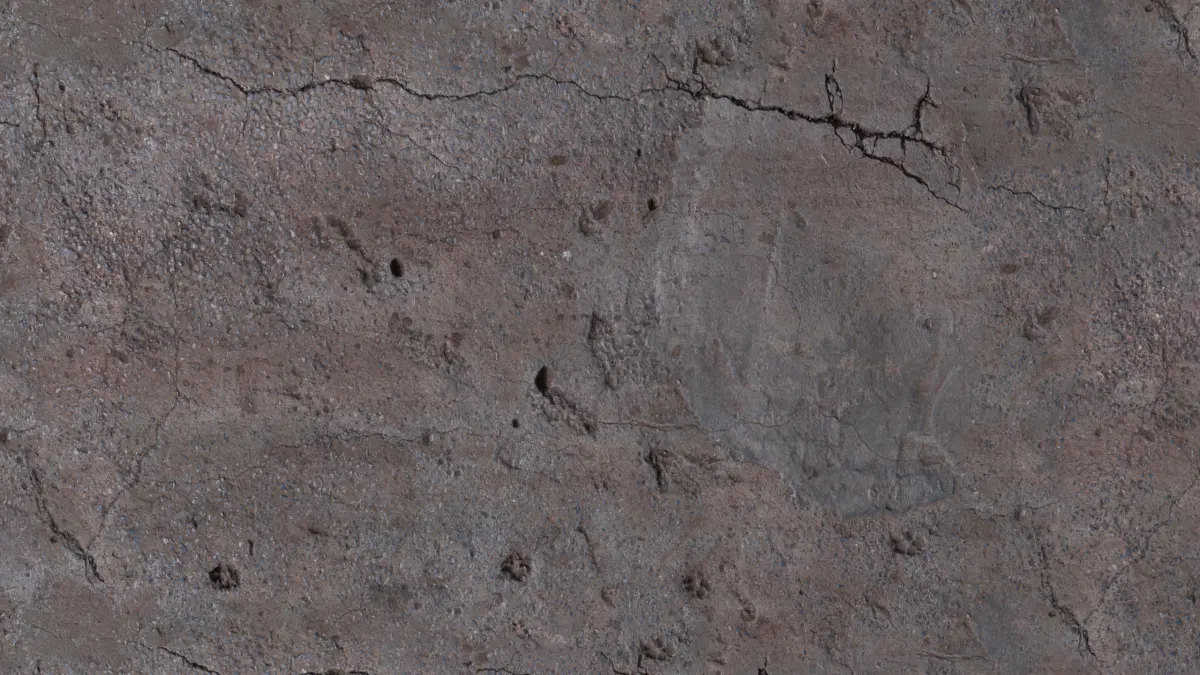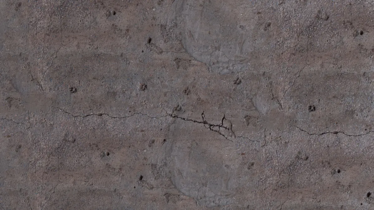 This damaged concrete ground texture features large fracture lines, surface pitting, and rough erosion marks, making it perfect for decayed infrastructure, abandoned roads, war zones, or industrial ruins. Its subtle material breakdown and variation in texture density make it especially useful for architectural visualization and urban environment detailing.