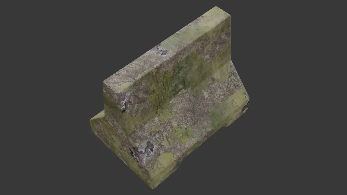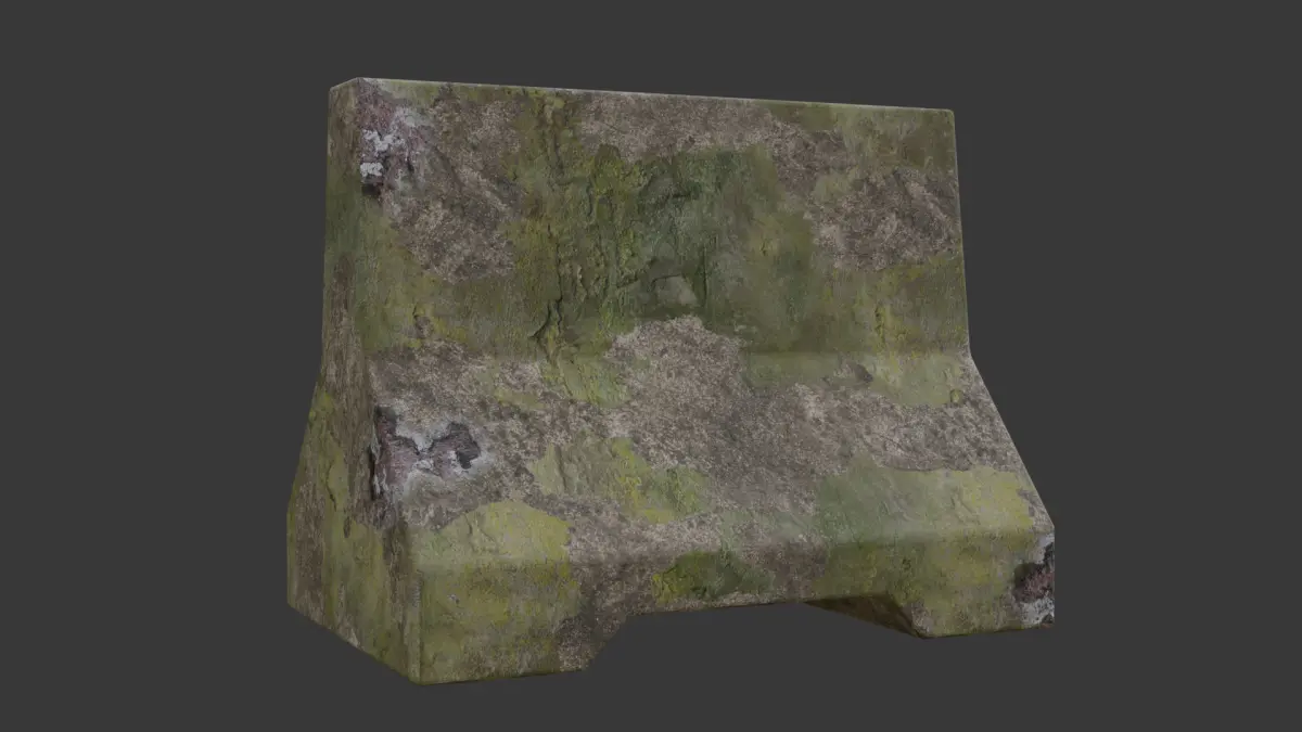 damaged concrete traffic barrier. Object used to control vehicle traffic. 3D model with well-organized mesh and few polygons. Model with PBR materials, textures, non-overlapping UV Layout map. Made in Blender 3.0.1 (Cycles) then exported to OBJ, FBX, STI e COLLADA.