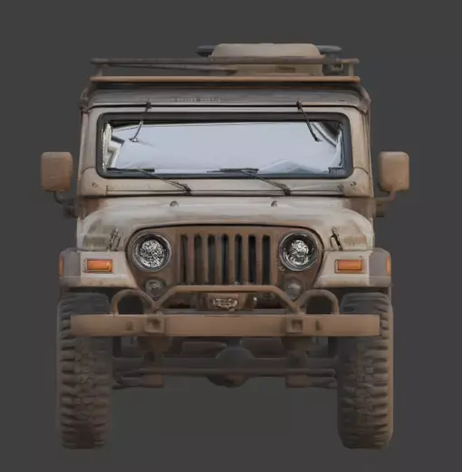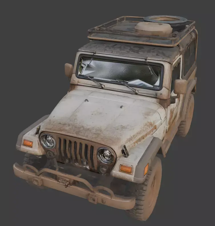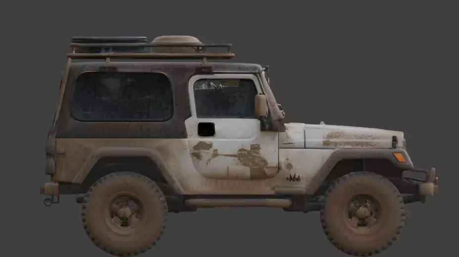 The vehicle displays significant structural wear, including a shattered and cracked windshield, punctured side panels, and a weathered roll cage. Mounted on oversized, mud-caked all-terrain tires, this model captures a lived-in grit. While some iterations feature an open cabin with exposed seating, others include a full roof rack loaded with survival gear and external fuel canisters, making it a versatile prop for high-stakes environmental storytelling.