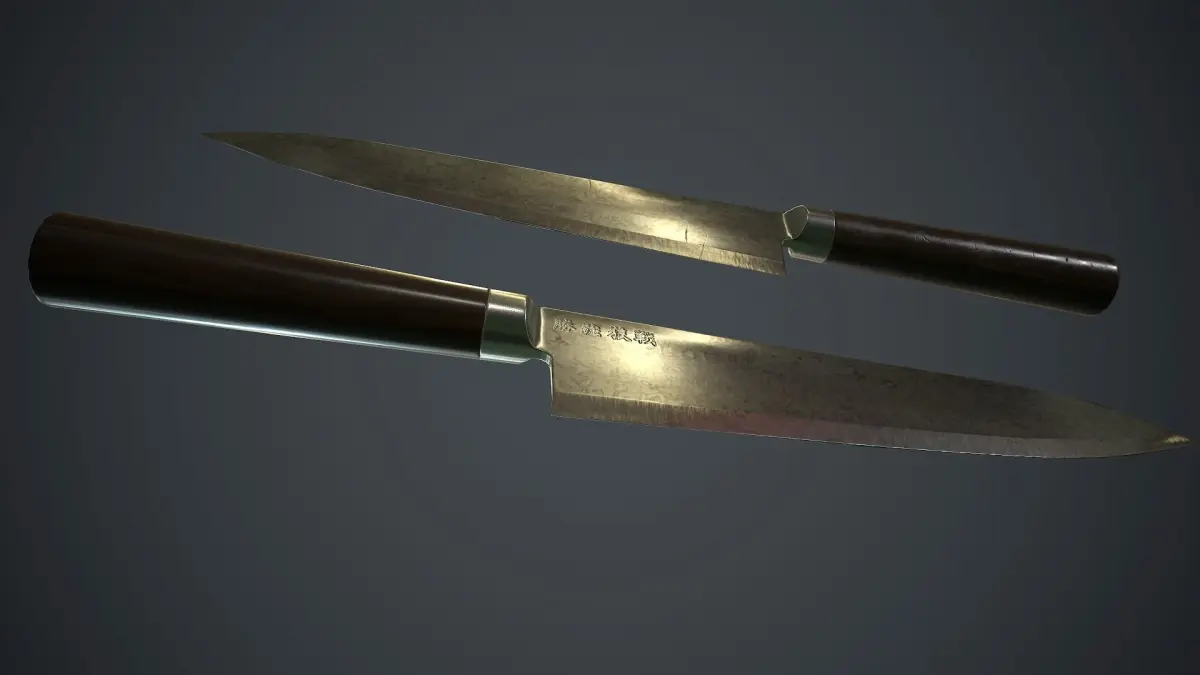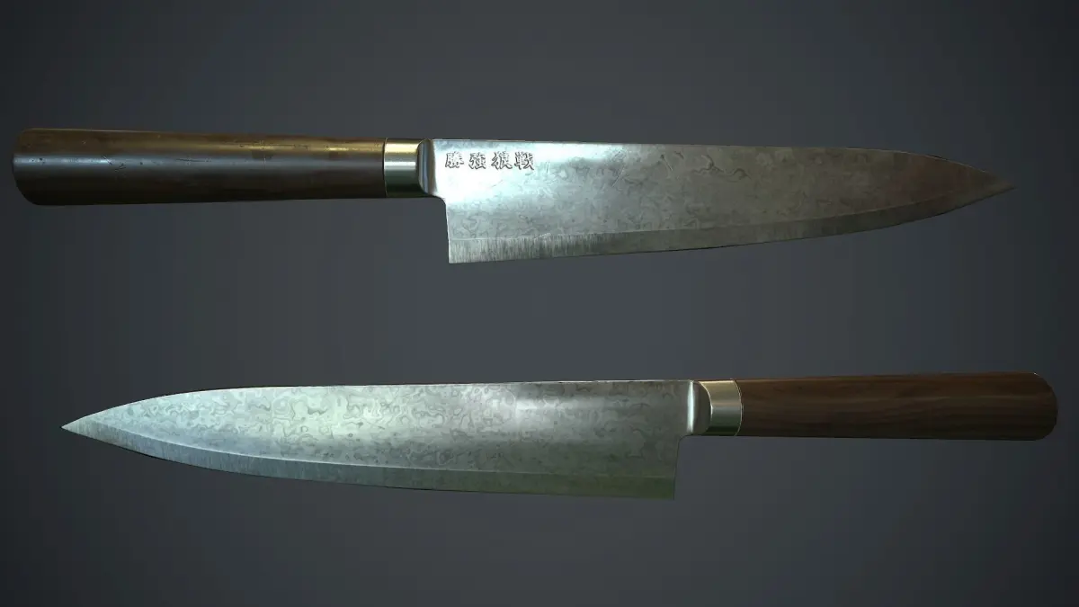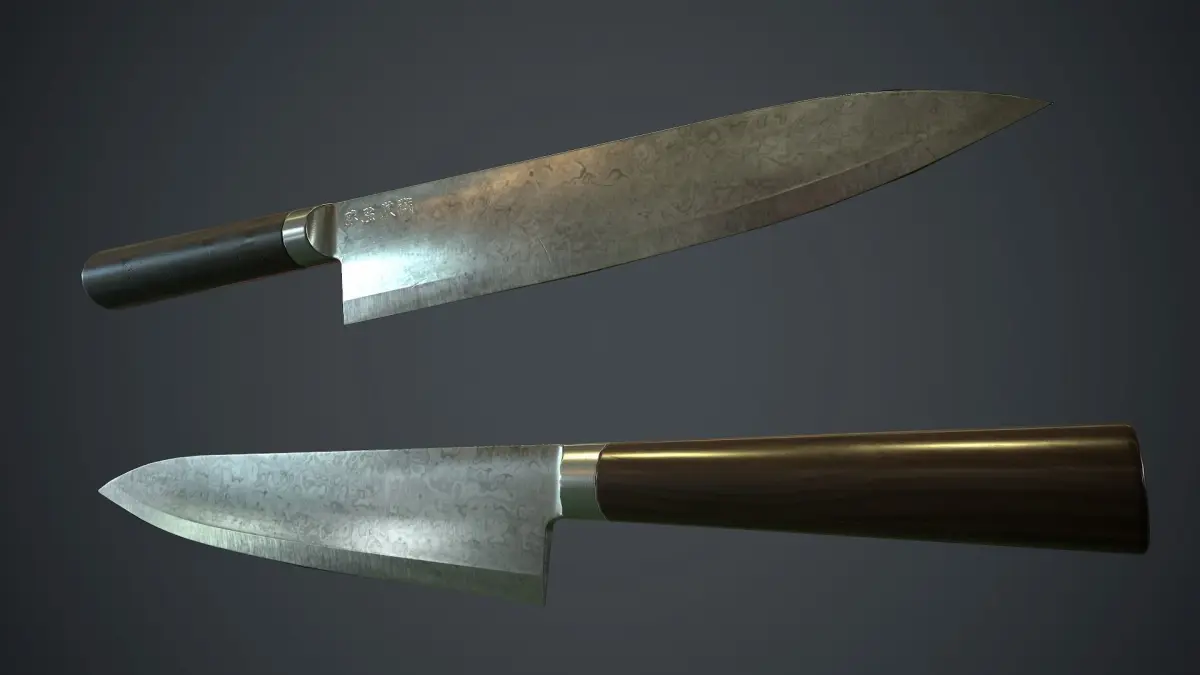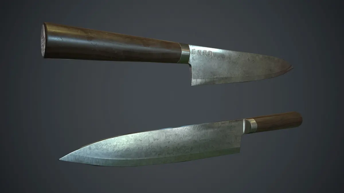 Low poly Damascus Kitchen Knife with PBR Textures. There are two different damascus knife variations: clean and dirty.