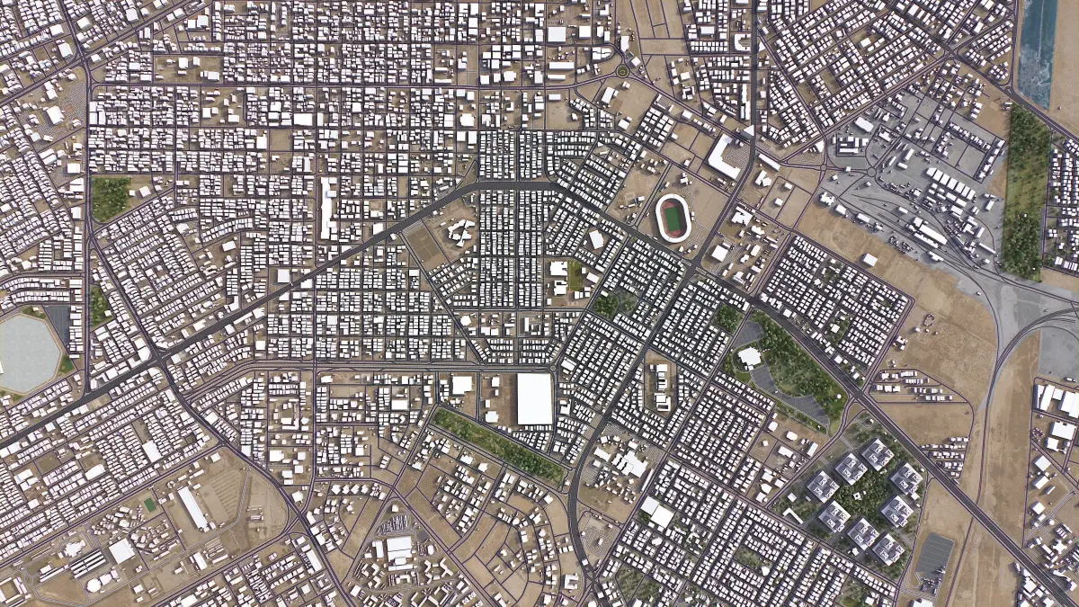 - Procedural textures assigned to all buildings