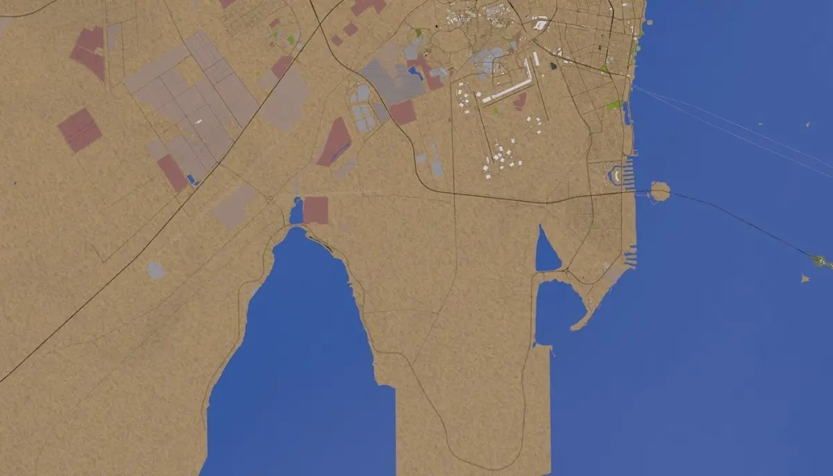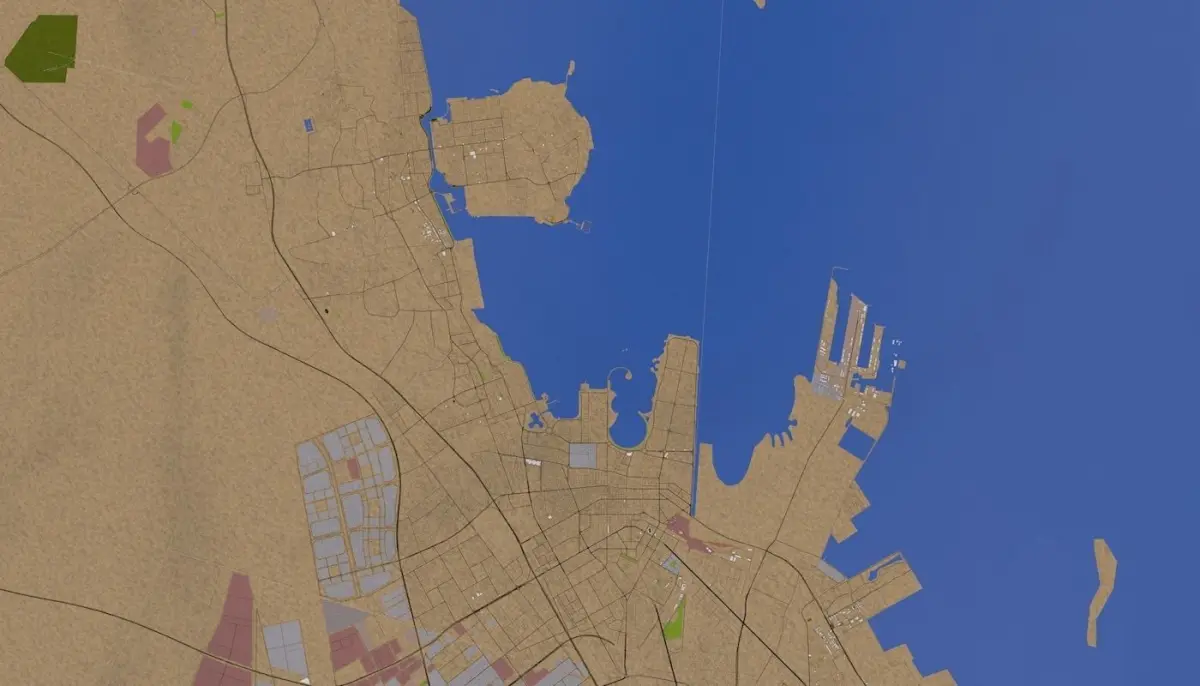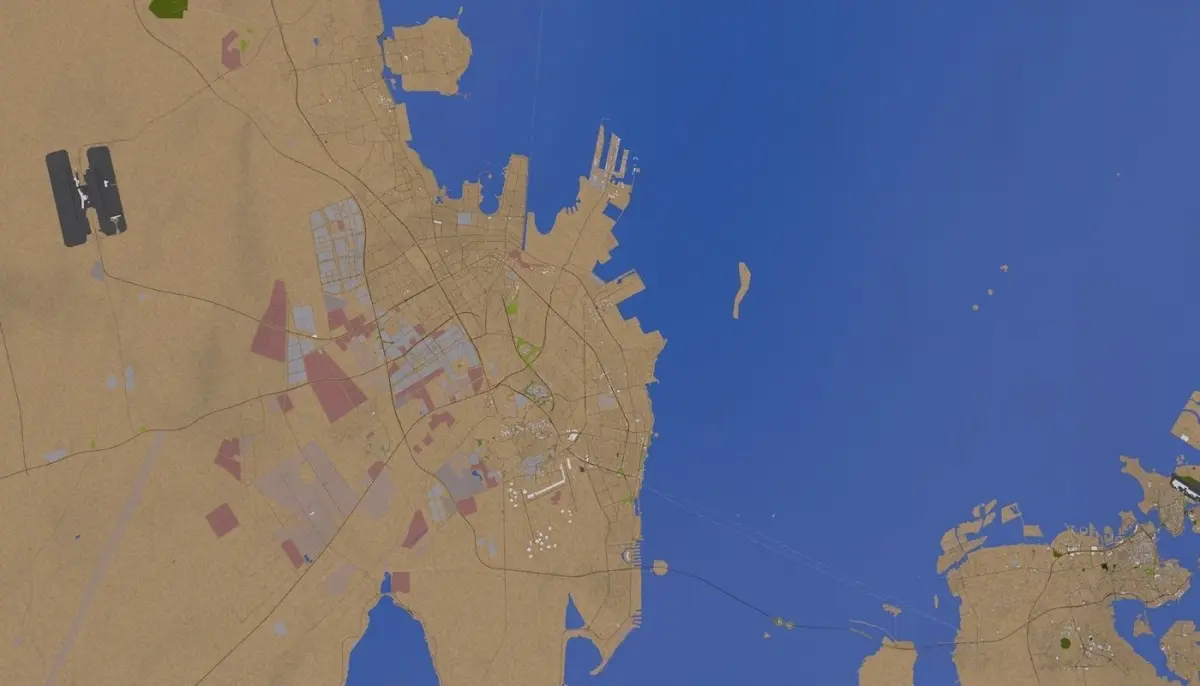 3D representation of Dammam City Saudi Arabia using 2019 map data. Roads, railway, land, water, buildings are made using real world data. Buildings are accurately placed and resembles the real world object up to some extend. Please note that random buildings (varying height) are added to those area where real world data is not available.