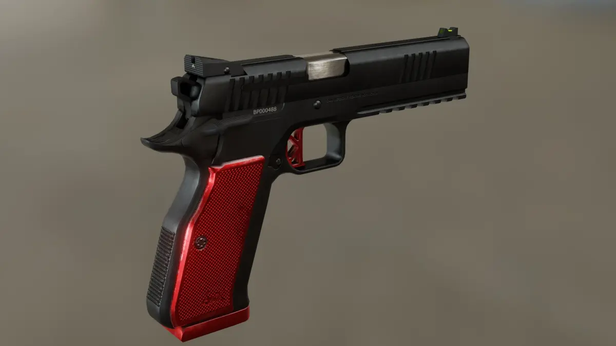 Dan Wesson DWX Pistol. A perfect mix of 1911 and the CZ 75 chambered in 9mm. All in fancy black/metalic red clothes.