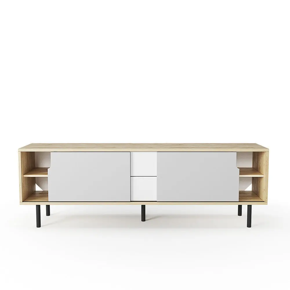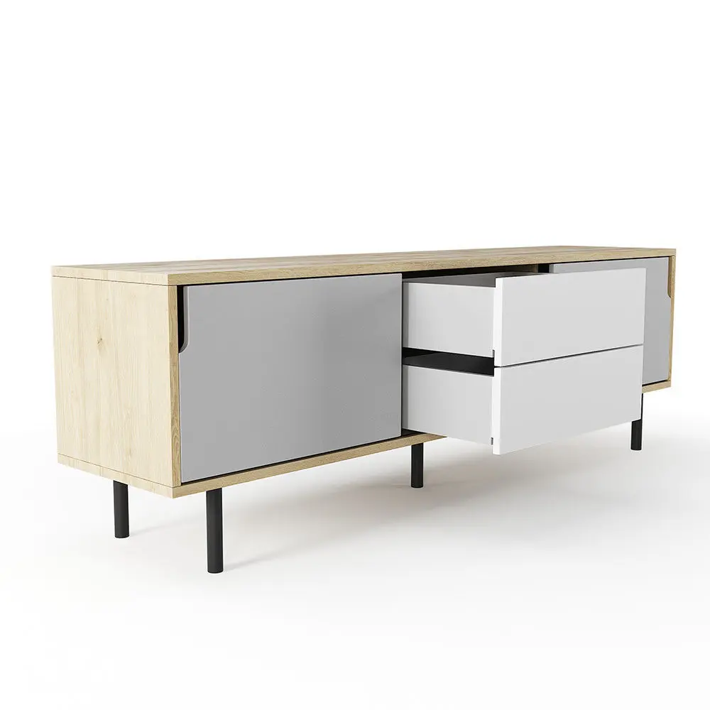 A three cabinet sideboard with two-toned notched sliding doors and two drawers, metal legs, and oak housing.