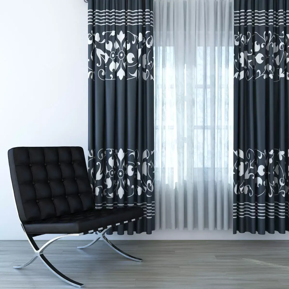 3D model of dark-blue and white curtains with semi-transpared material. Render scene is not included.