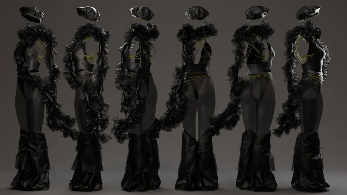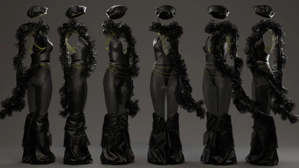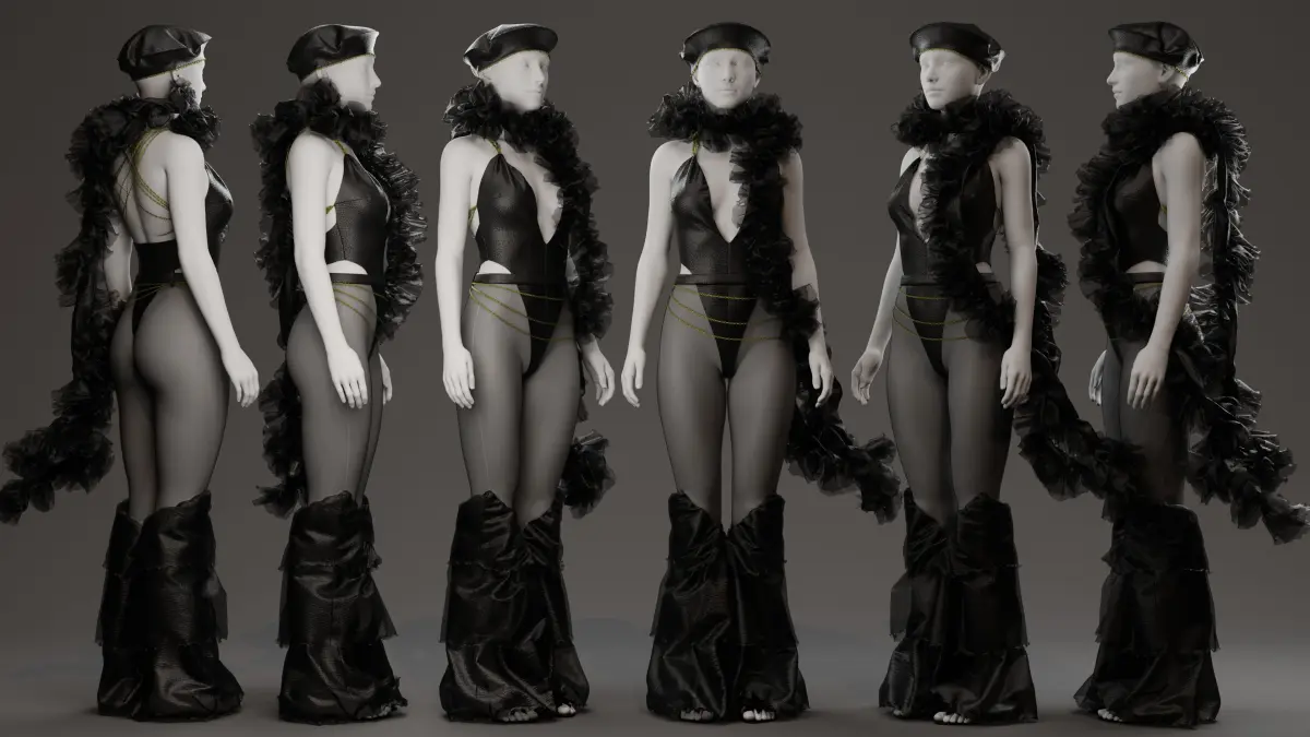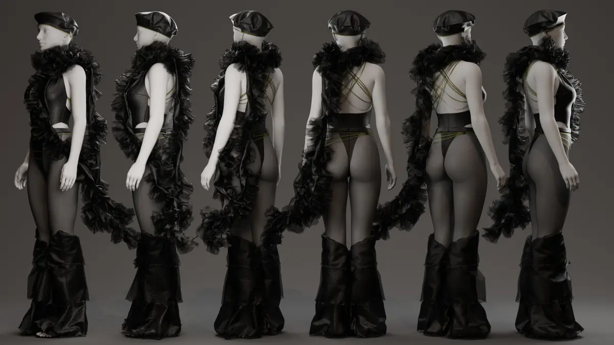 Design Details:Bodysuit Base: Deep plunging neckline with a sheer mesh panel, combined with sleek black satin fabric for a structured yet fluid fit.Strappy Detailing: Delicate golden cord-like straps wrap around the waist and back, creating an elegant and intricate layering effect.Ruffle Accents: Dramatic ruffled shoulder and back details, extending into a floor-length cascade, add movement and a theatrical edge.Flared Pants: The lower half transitions into structured, voluminous flared pants with a subtle sheen, creating a futuristic silhouette.Accessories: Styled with a beret-style headpiece and a high ruffled collar for an additional touch of vintage-meets-futurism aesthetic.Compatibility & Usage:Ideal for digital fashion presentations, 3D character design, metaverse avatars, and fashion concept renders.Compatible with Marvelous Designer, Clo 3D, Blender, and other 3D software for further customization and simulation.High-quality mesh with well-optimized topology for realistic draping and animation.This ready-to-use digital garment is perfect for designers, digital artists, and fashion innovators looking to push creative boundaries.