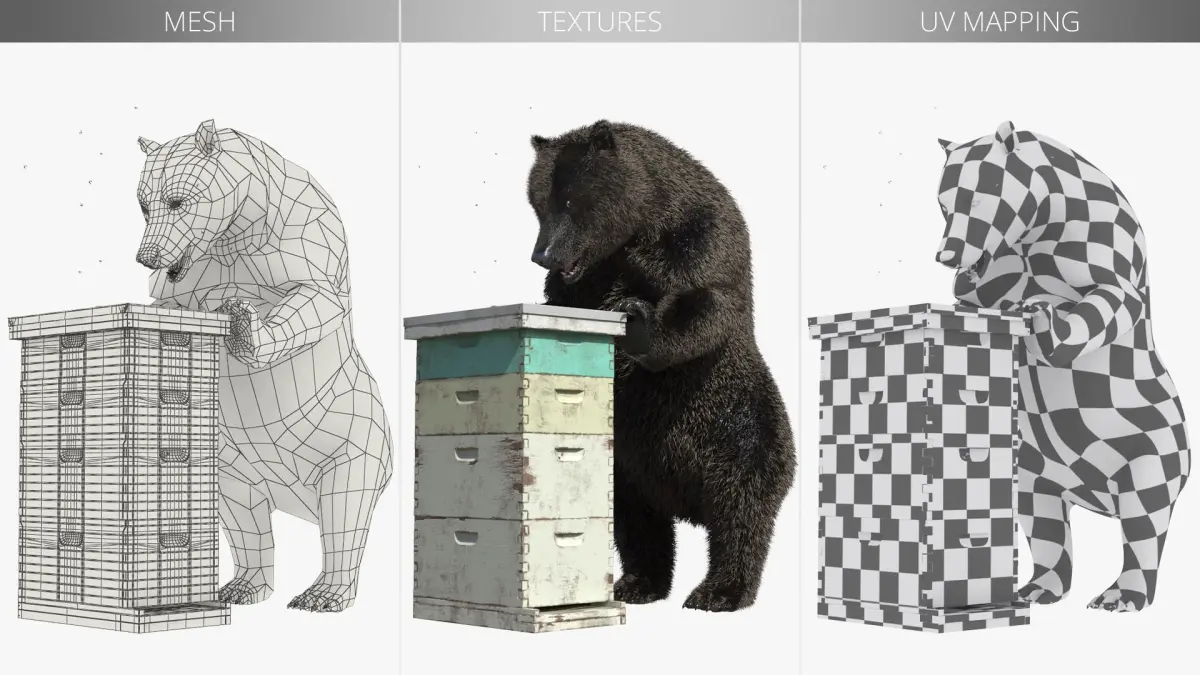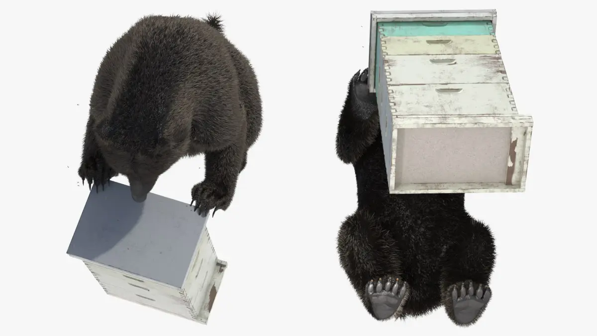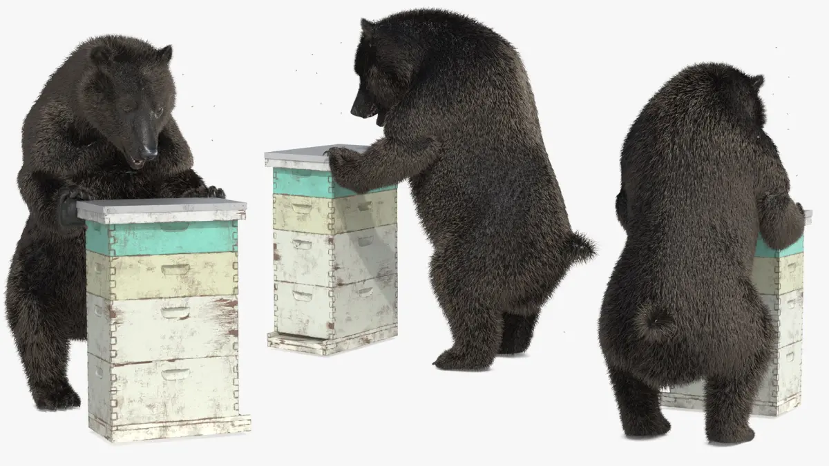 Dark Brown Bear Raiding Beehive Fur is a high quality, photo real 3d model that will enhance detail and realism to any of your rendering projects. The model has a fully textured, detailed design that allows for close-up renders, and was originally modeled in 3ds Max 2020 and rendered with V-Ray. Renders have no postprocessing!