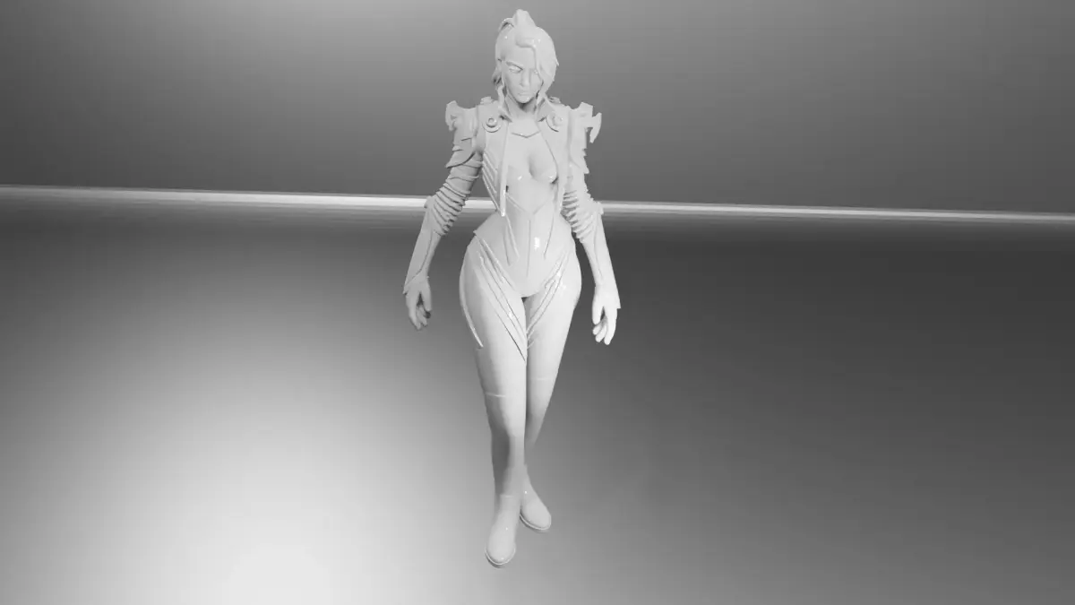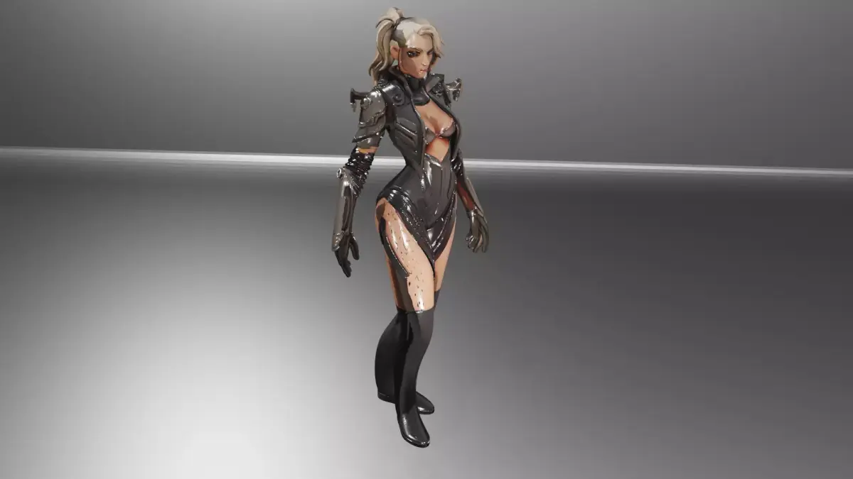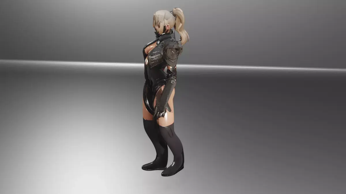 A stylish and futuristic 3D female character designed with a dark cyberpunk aesthetic. The model features glossy black armor, elegant high boots, and a sleek bodysuit with detailed metallic accents. With short blonde hair and a powerful presence, this character is perfect for use in sci-fi projects, video games, animations, and cinematic renders.