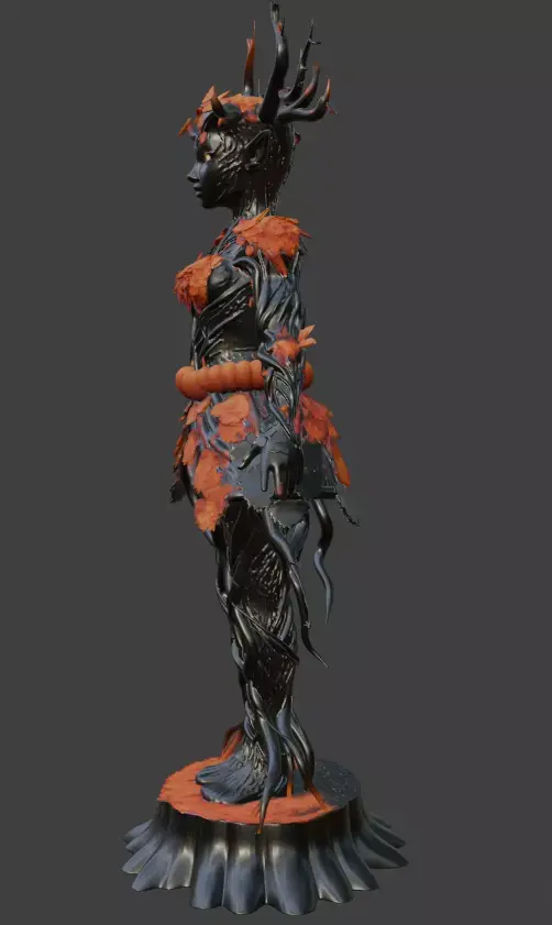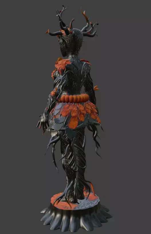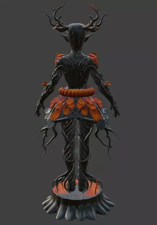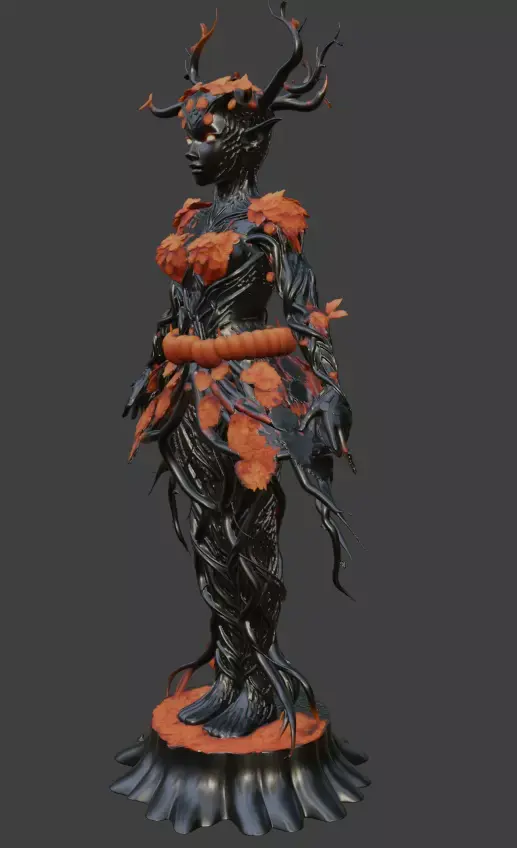 Beautiful dark dryad covered in twisted black branches, orange pumpkins, autumn leaves and big antlers. Perfect Halloween/autumn decoration or fantasy collection piece. Super detailed, easy to print and paint.