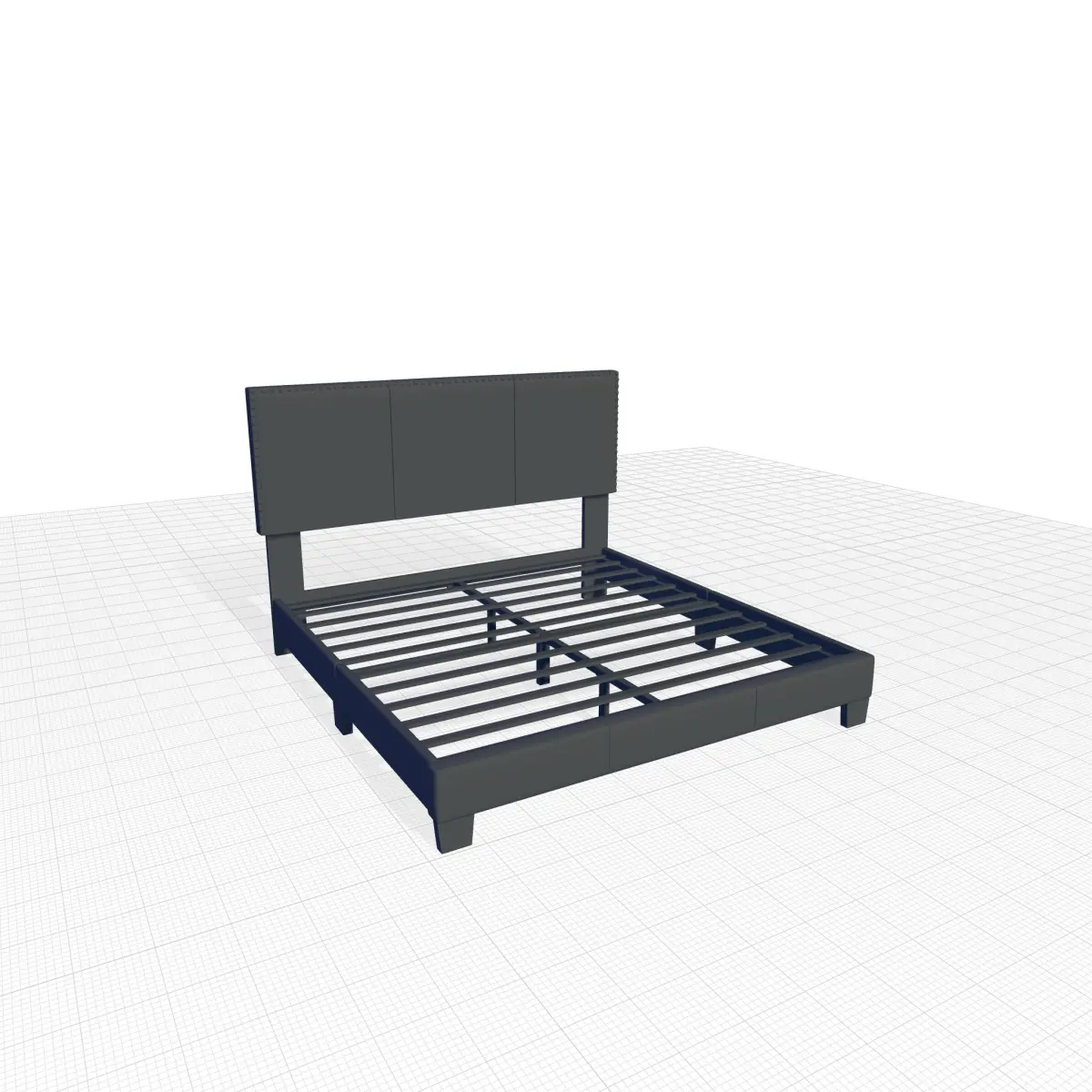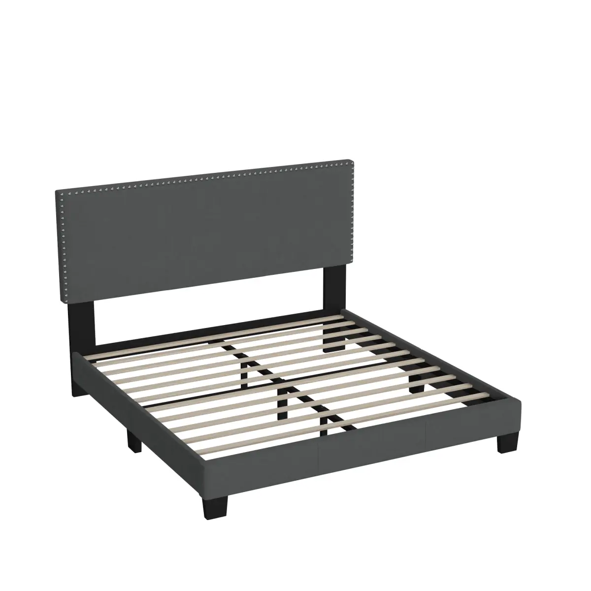 - Modern style with an understated design created this wonderful upholstered panel bed. Brushed nickel rivets add a touch of timeless style. Neutrally toned upholstery can coordinate with many color themes. Features a rubberwood frame for added strength and durability.