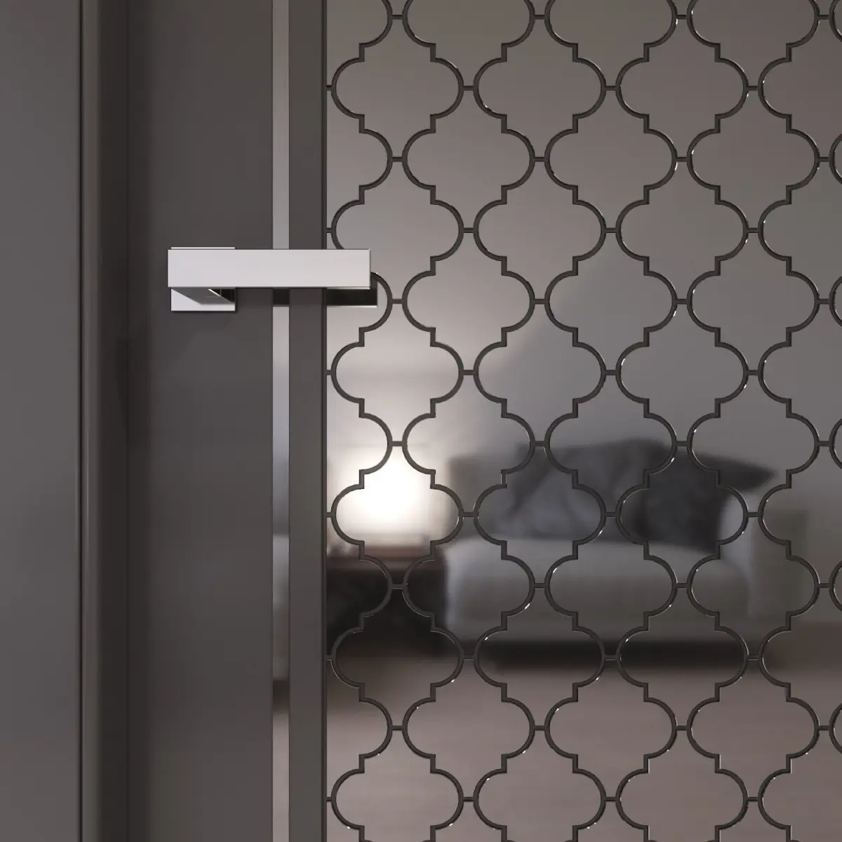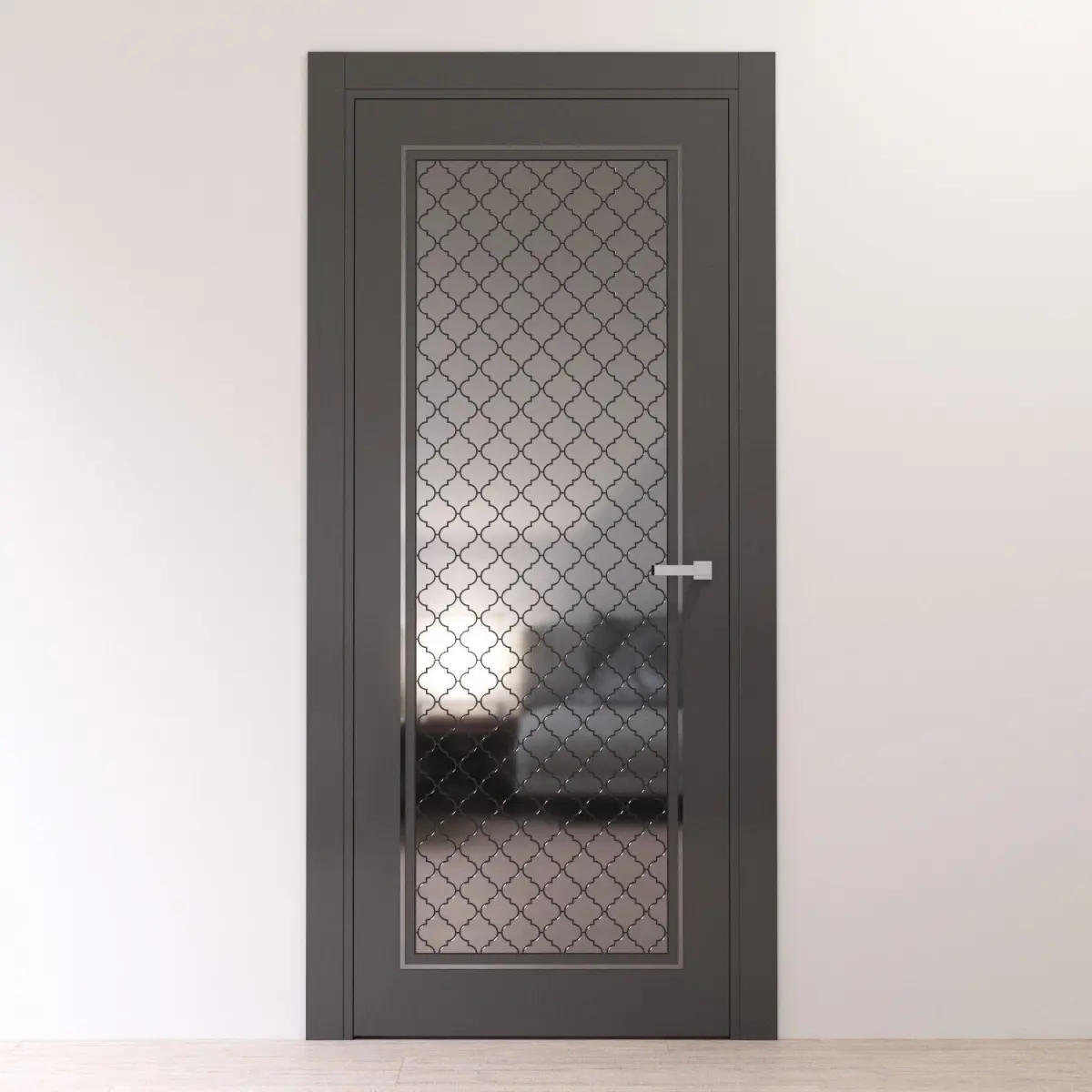 Dark gray interior door with shiny metal tiles.Arabesque style in a modern interior.Overall size of door leaf 2000 x 800 x 40 mm.Prepared for high resolution realistic renders. Previews were rendered in 3ds Max 2015, Corona renderer.Lighting, cameras and studio setups are not included.