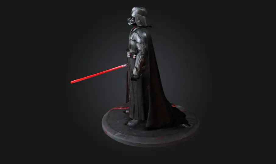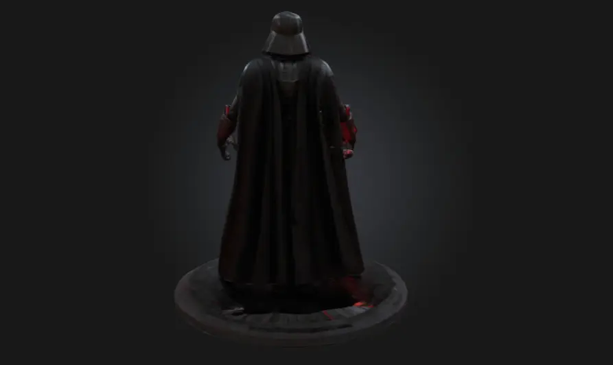 This highly detailed 3D printable figure represents a powerful Sith Lord, standing in an imposing stance, gripping his red energy sword. His helmet, cape, and armor are designed with intricate sci-fi textures, capturing the essence of a formidable dark warrior. The figure stands on a textured sci-fi base, evoking the atmosphere of a distant galactic battlefield.
