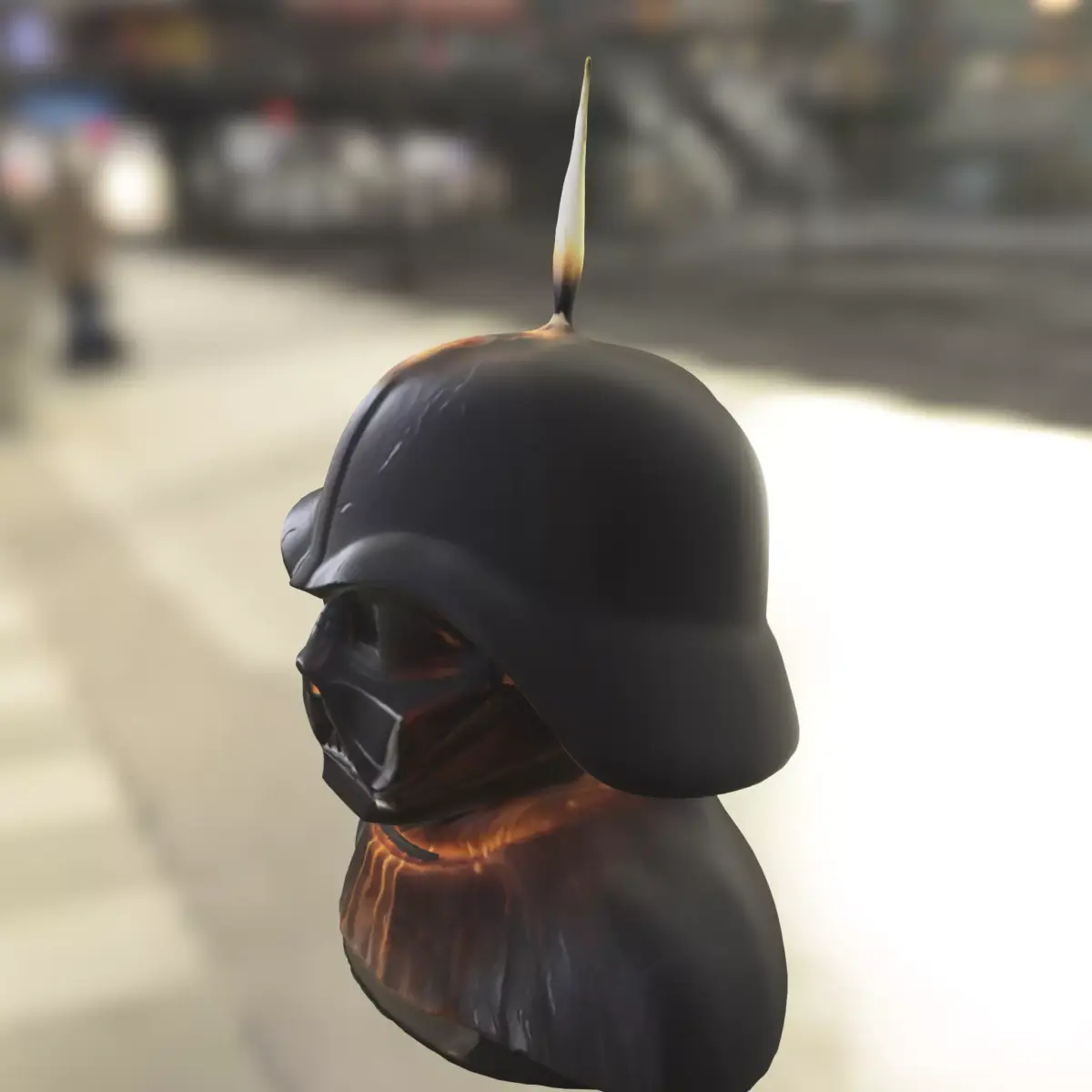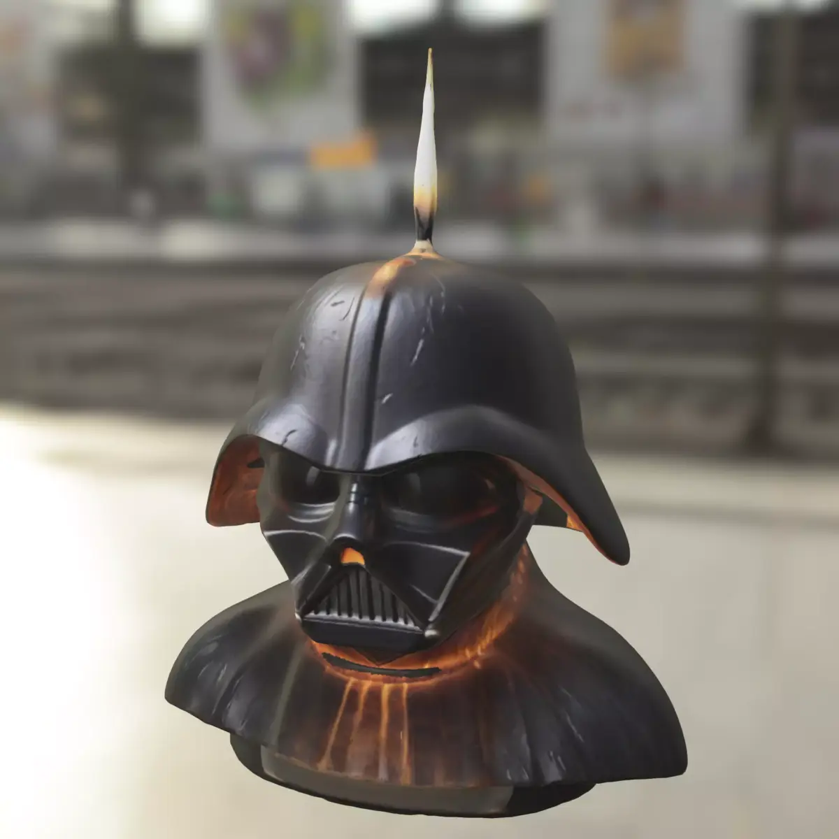 A detailed 3D model of a dark sci-fi inspired bust designed as a candle statue, featuring a menacing helmeted figure with glowing light effects. Ideal for use as a decorative prop, collectible item, or environment detail in popular games such as Star Wars-inspired mods, Cyberpunk 2077, Skyrim, Fallout, and Unreal Engine or Unity-based projects. This versatile asset is optimized for both digital game design and physical 3D printing, making it perfect as a unique collectible, tabletop decoration, or display figure. Provided in OBJ, FBX, STL, DAE, PLY, GLB, and Blender formats.
