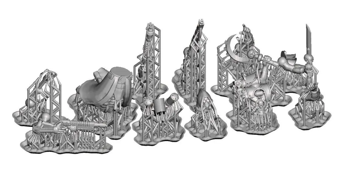 This is a full model kit for creating Dark Techno troops. All of the parts previewed are included :14 Right arms with several weapons and poses + 3 tentacle legs poses + torso + backpack + 3 heads + 10 Left arms with several close combat weapons and poses + servo tripod for sniper rifle + 2 basesThe kit may be used to build both shooters or vigils (long range, or short range). Scaled for 28mm gaming. Recommended resin printing, or FDM with a 0.2mm nozzle.