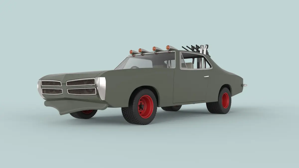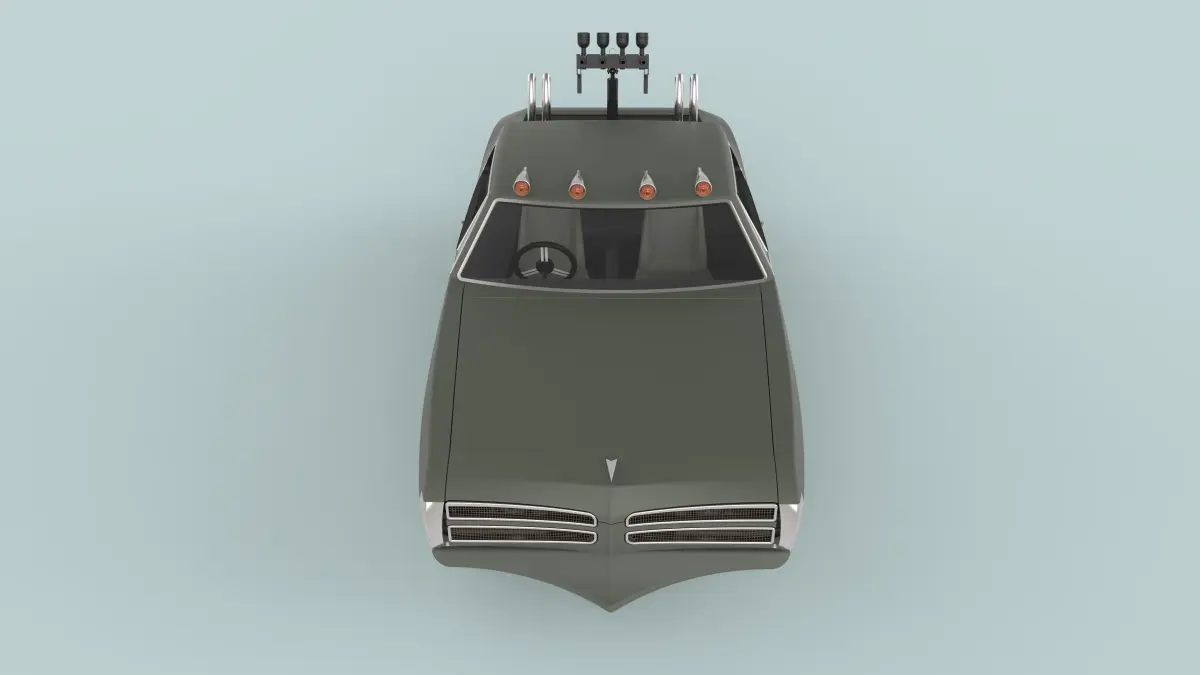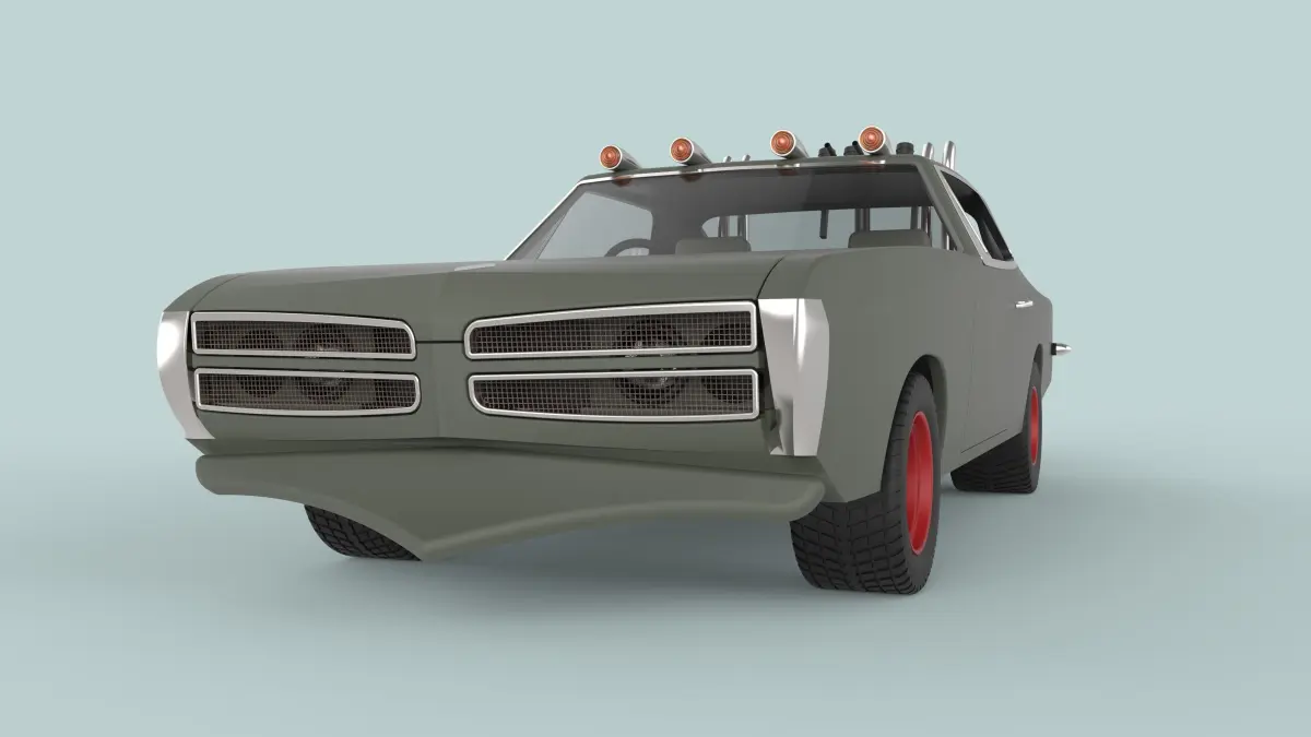 Green vehicle with the dart gun and a bat painted on the bonnet that crashes into a pile of wrecked cars is a Chrysler by Chrysler CH Hardtop 1971. For the movie, the Chrysler was fitted with a 1966 Pontiac Bonneville bonnet and front grille. The rear window was removed along with the boot. At the very end of the boot a narrow panel was installed for the gunner to sit on. The section separating the cabin from the boot was removed as well. Four truck style exhaust pipes were installed in the newly formed 'utility' area, right behind the cabin. Inside the cabin there is only the driver's seat and a variety of animal skulls on the dashboard. A net is visible hanging from the passenger doors. The cabin is also reinforced with a rollcage. A four barrel dart gun was installed in the back and four truck style roof lights were installed on the cabin. A green skull with blue bat wings is painted on the bonnet.