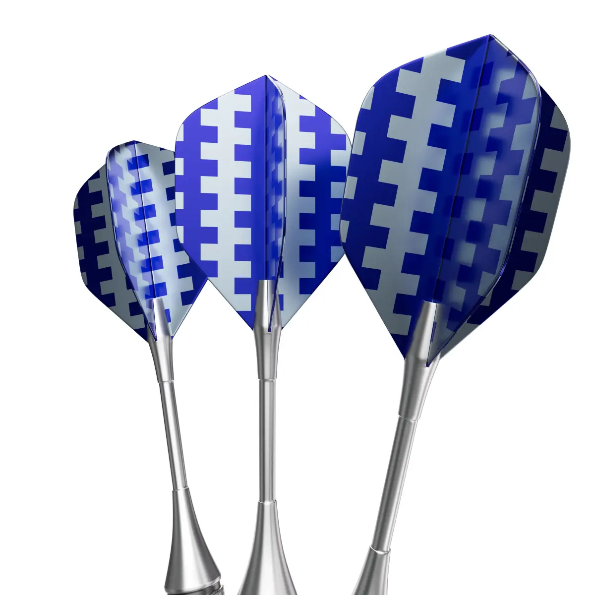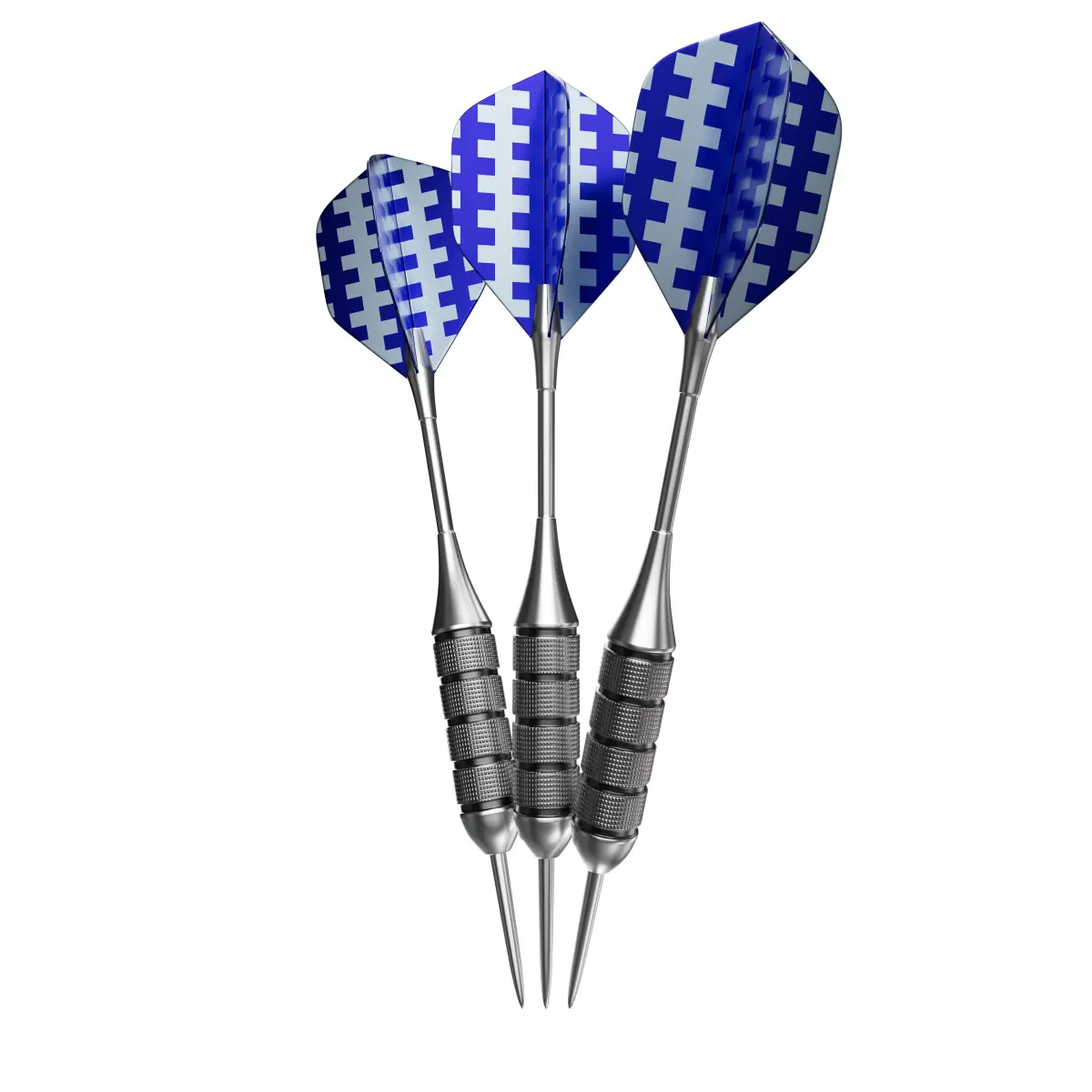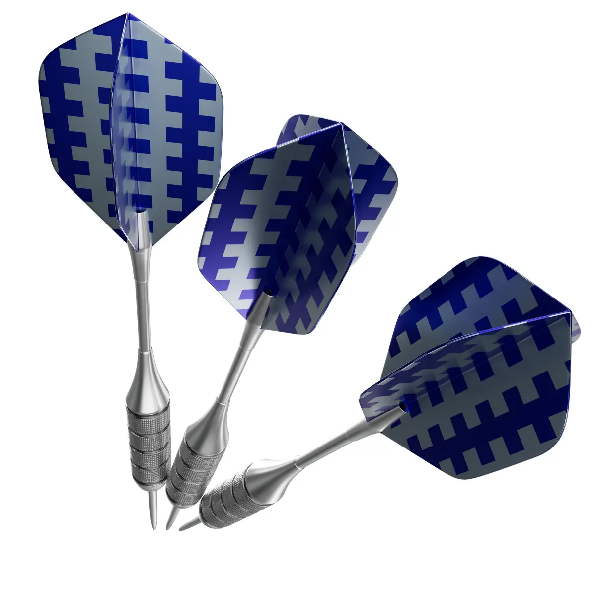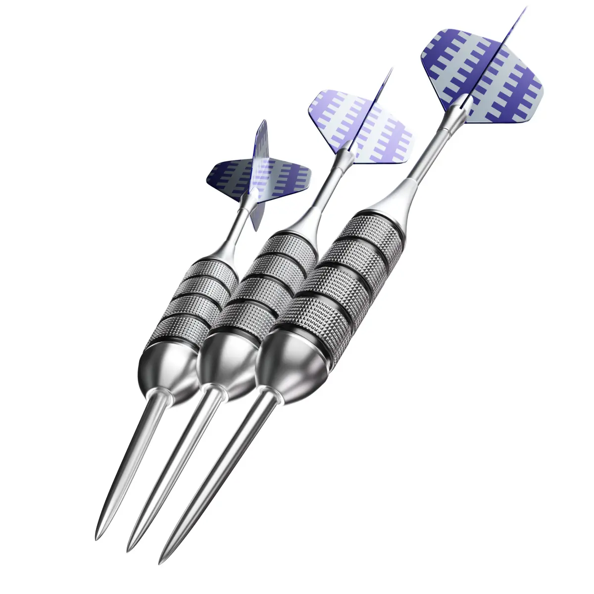 A regular set of three metal sports darts with a displacement grip and foil metal flights.