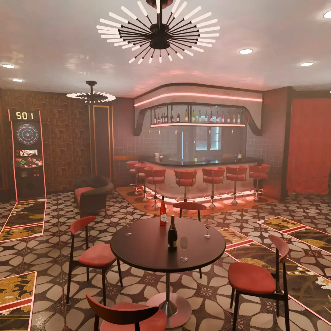 This product is a 3D model of a “Darts Bar” created in Blender.We meticulously recreated the sophisticated ambiance of a city night, featuring a cool black bar counter, soft indirect lighting, and a glowing darts machine in the back.