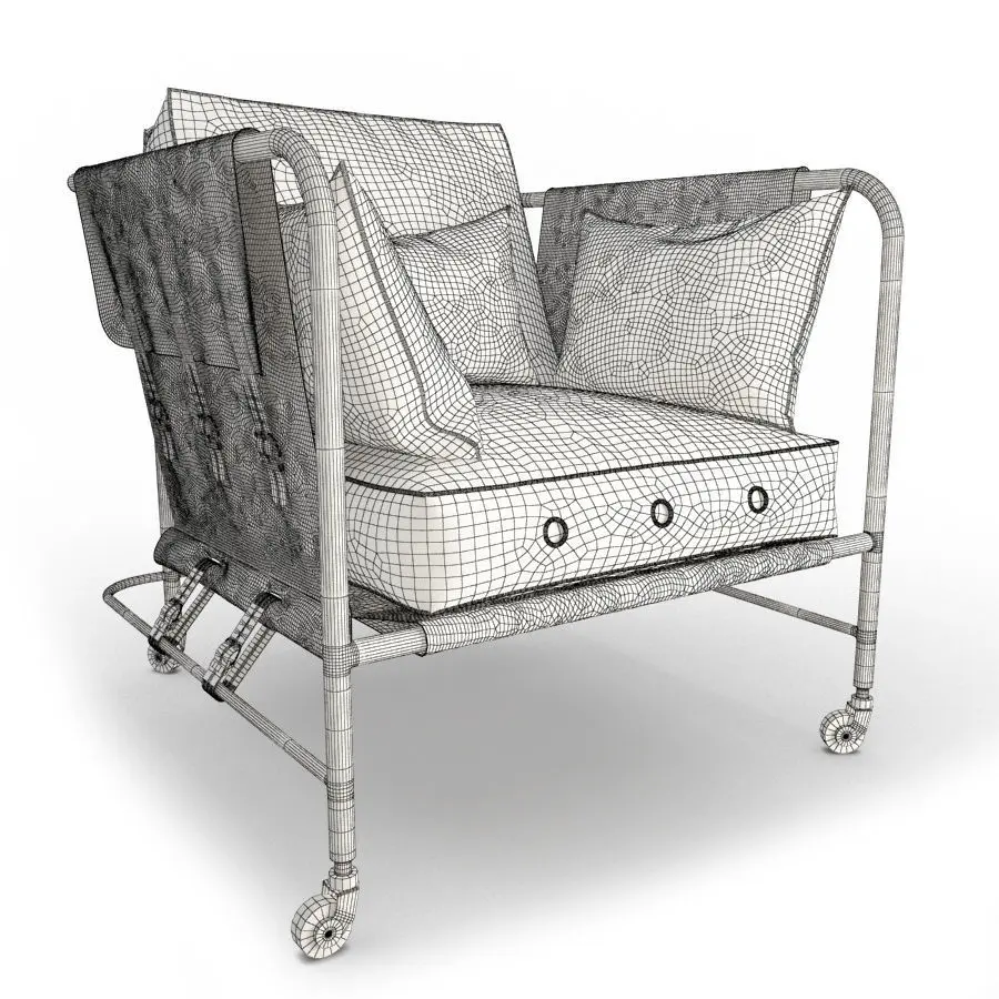 Metal structure, seat and cushions in canvas and leather that give a military industrial style to this furniture.