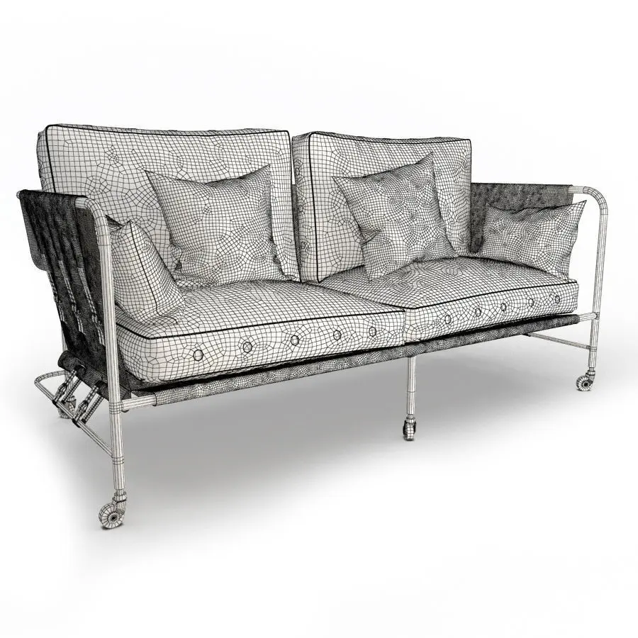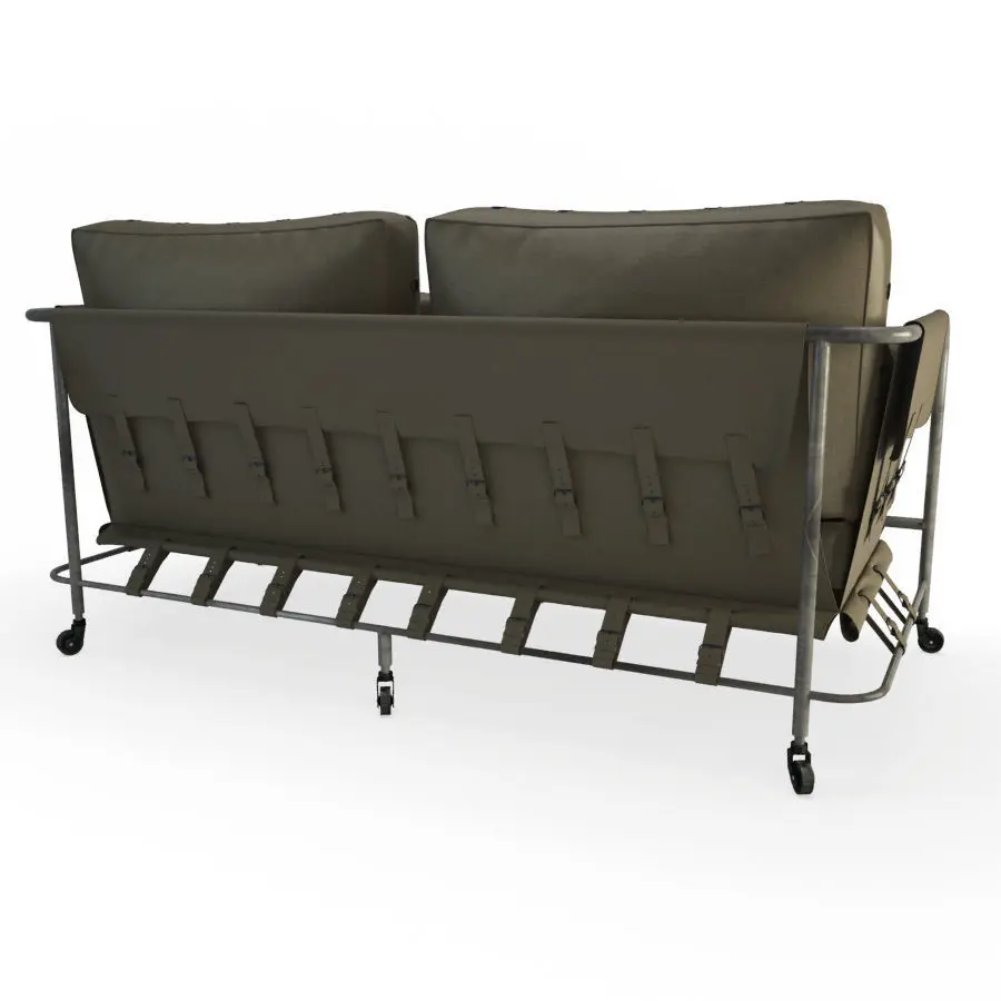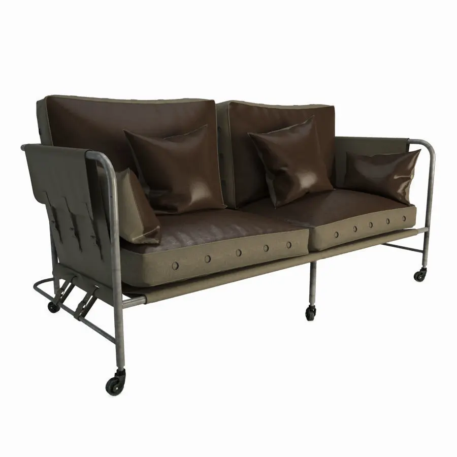 Metal structure, seat and cushions in canvas and leather that give a military industrial style to this furniture.