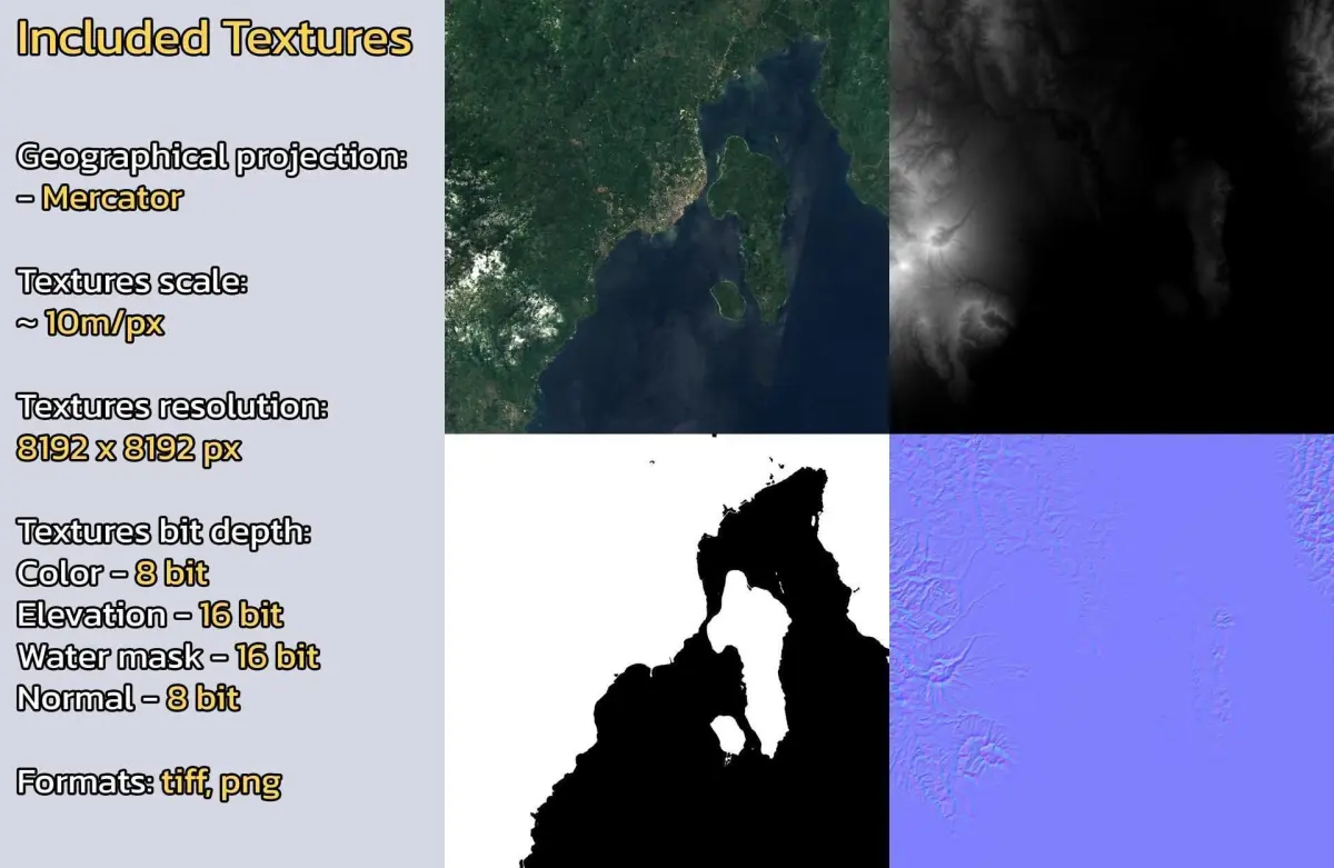 Warning: minor clouds/artifacts may be present on the diffuse color satellite texture due to the nature of the dataset. Check product images.