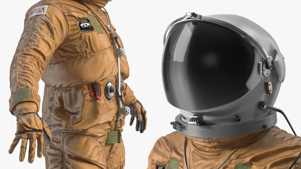 The model accurately depicts the S1030 suit developed by the David Clark Company, known for its use in U.S. Air Force and NASA programs. It features an orange pressurized flight garment with detailed stitching, joint mobility structures, and life-support connection ports. The helmet, gloves, and integrated communication components are precisely modeled, showcasing authentic material textures and hardware typical of advanced aerospace gear.