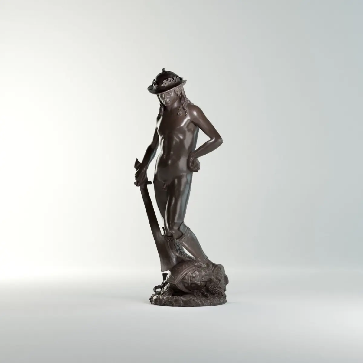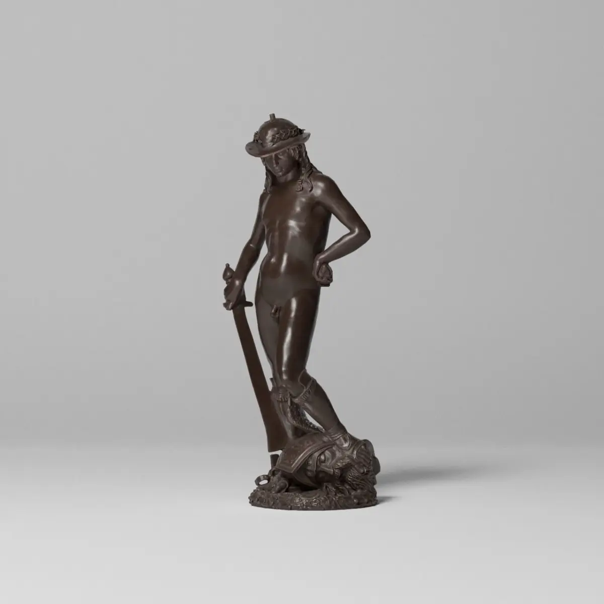 David (with the Head of Goliath) by the Italian early Renaissance sculptor Donatello. Bronze figure depicts biblical hero David, nude except for helmet and boots. This bronze David is ultimately famous for being the first unsupported standing work of bronze cast during the Renaissance, and the first freestanding nude male sculpture made since antiquity.