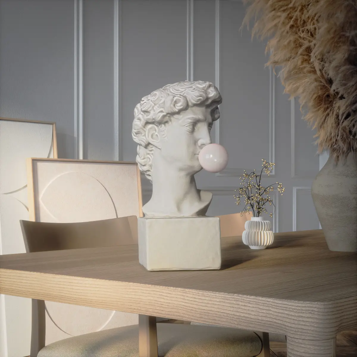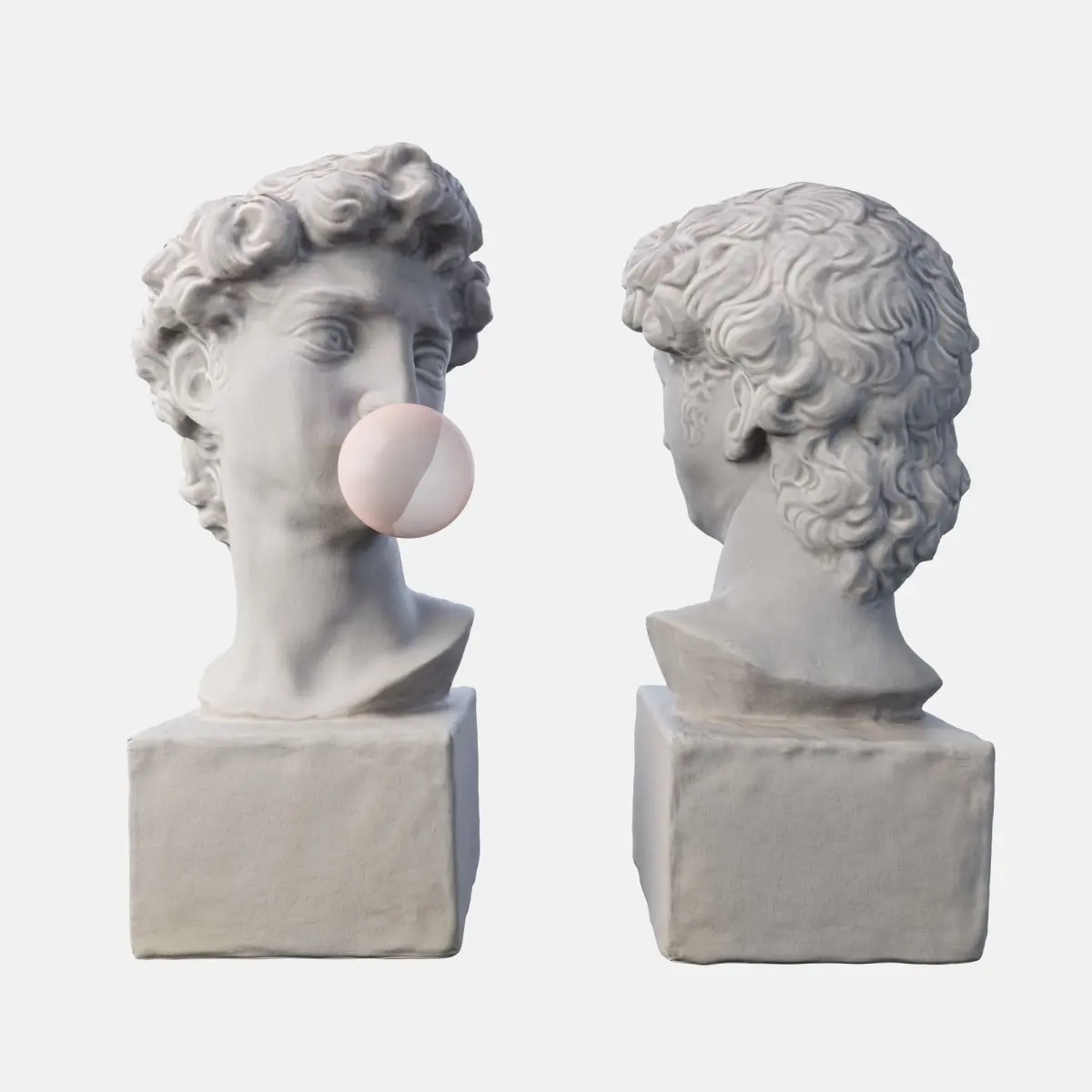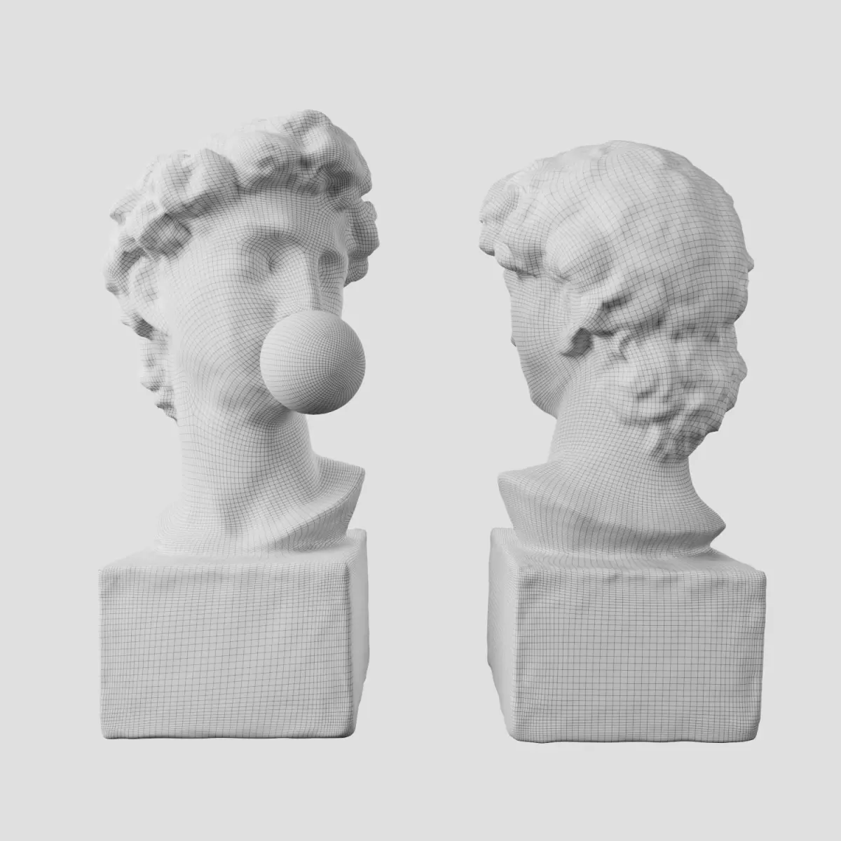 This unique 3D artwork presents a bust of the biblical David, rising from a marble base. The sculpture captures not only the majestic figure of David but also introduces an intriguing contemporary element - a balloon-shaped bubblegum held by him at his lips.