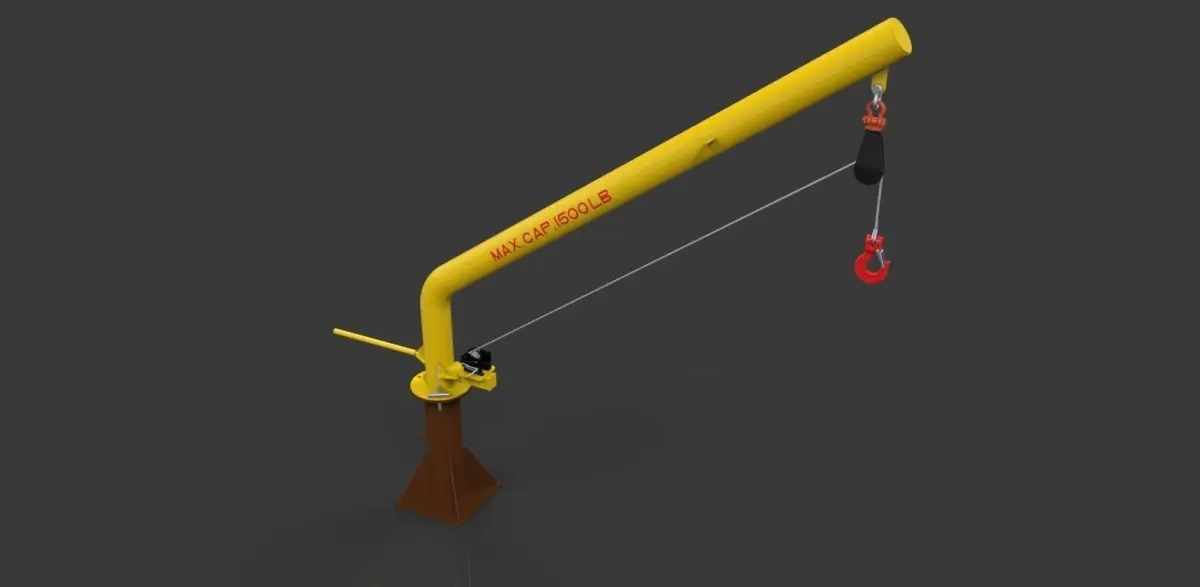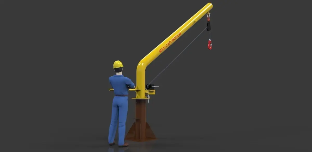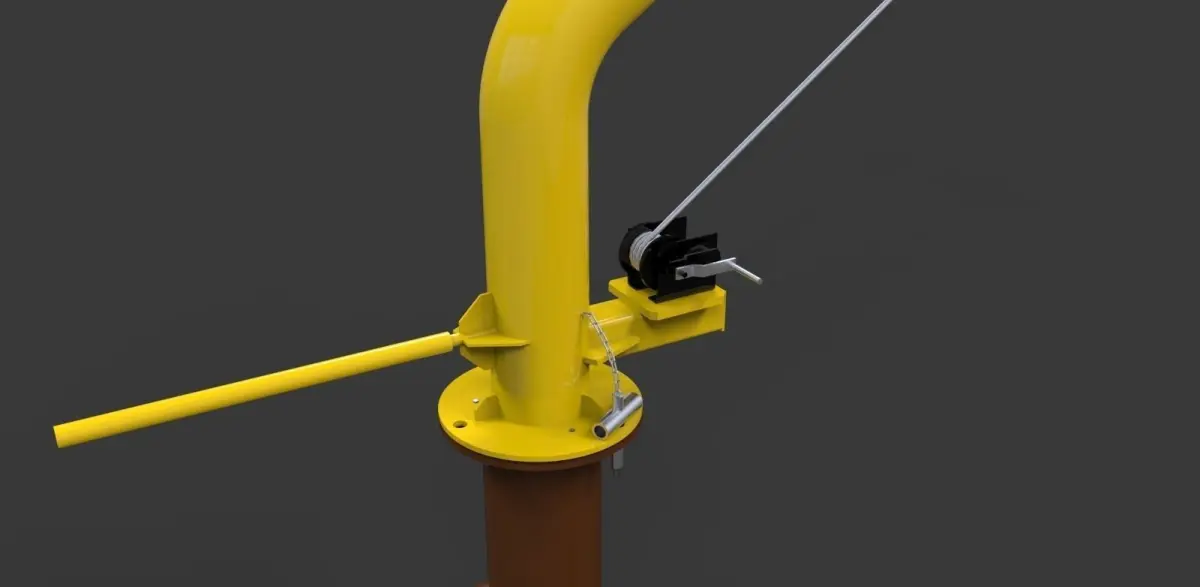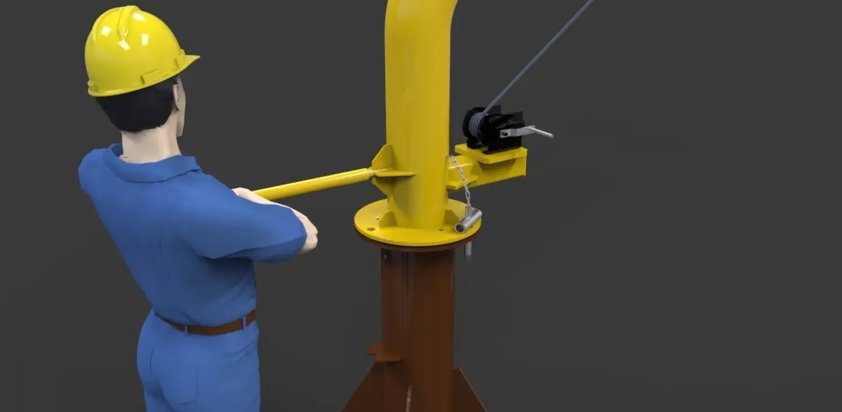 davit crane manually rotated with a bar and manually lock with a "T" pin and manual winch. 1/4 plugs greaser on top bearing ring to grease the center between bearing ring, 1/4 plugs for greaser hole of the crane base to grease pipe inside to help rotation. snatch block with shackle.