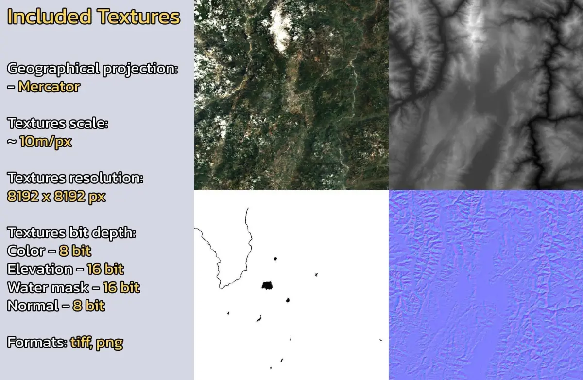 Warning: minor clouds/artifacts may be present on the diffuse color satellite texture due to the nature of the dataset. Check product images.
