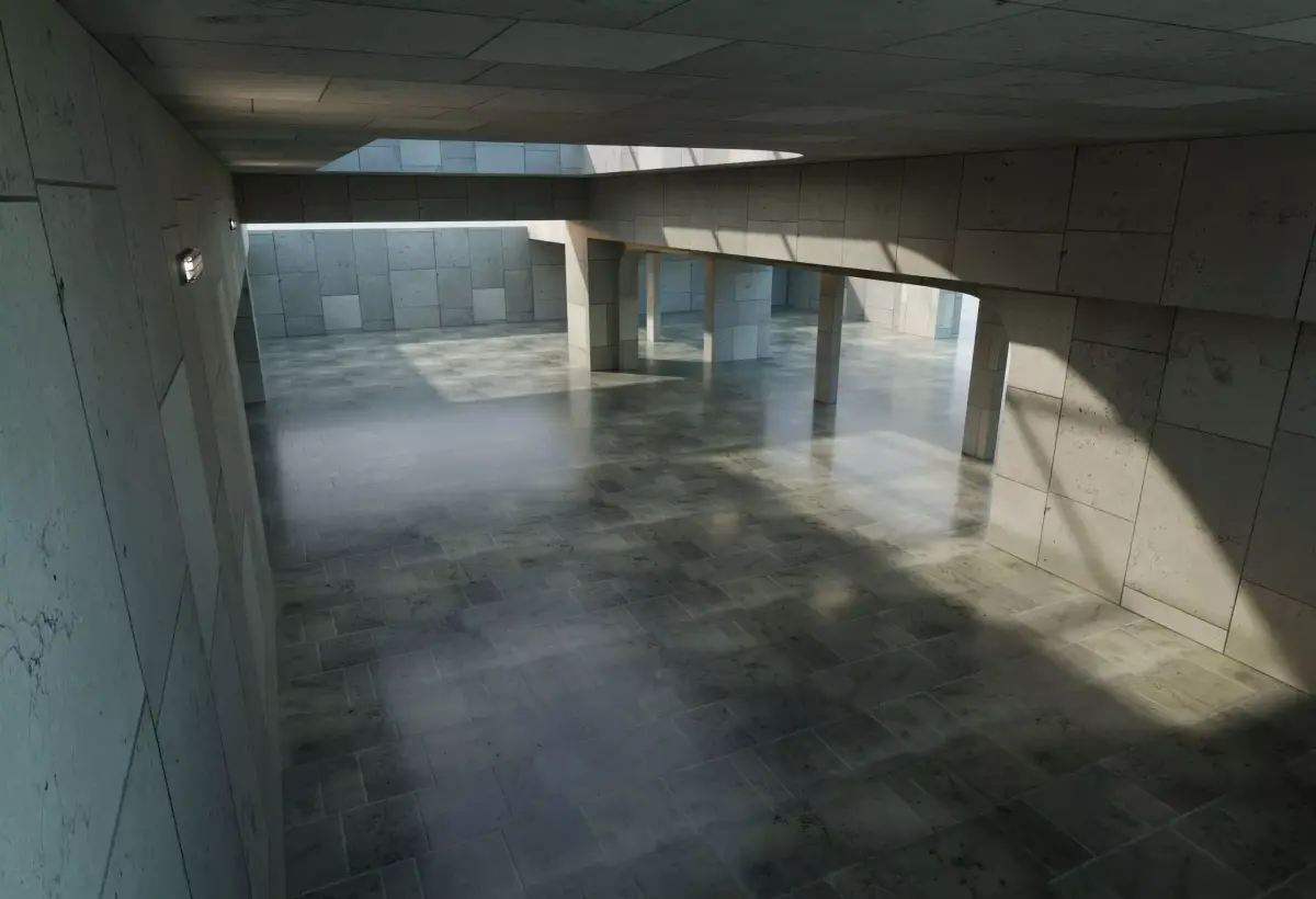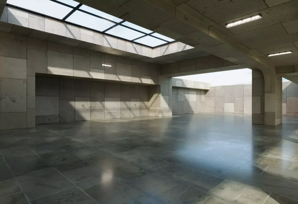 This concrete atrium environment features a clean open layout with skylight lighting, realistic concrete surfaces, and soft natural daylight. The neutral design makes it suitable for vehicle rendering, product visualization, cinematic scenes, or concept art presentations. Its minimal structure and balanced reflections provide a modern architectural background that integrates easily into a wide range of 3D workflows.