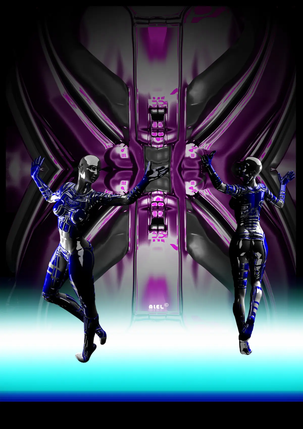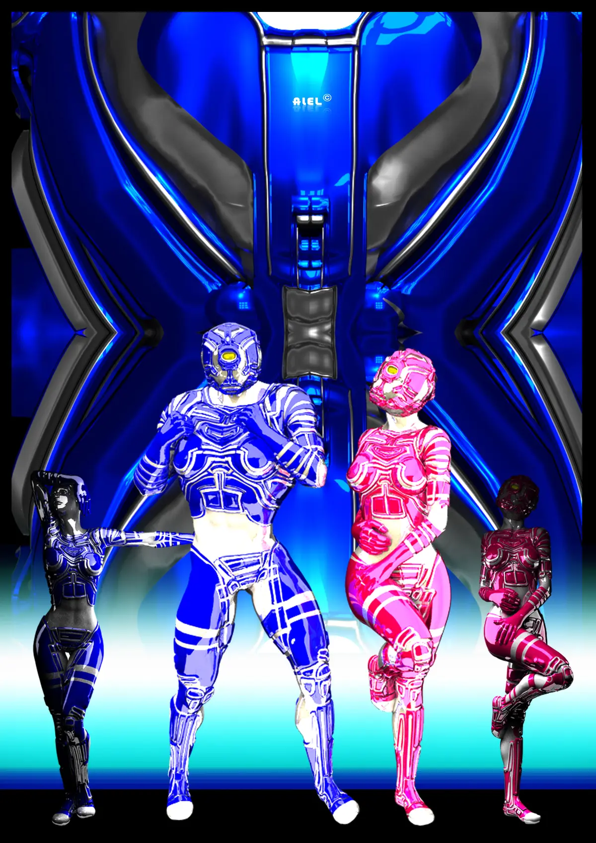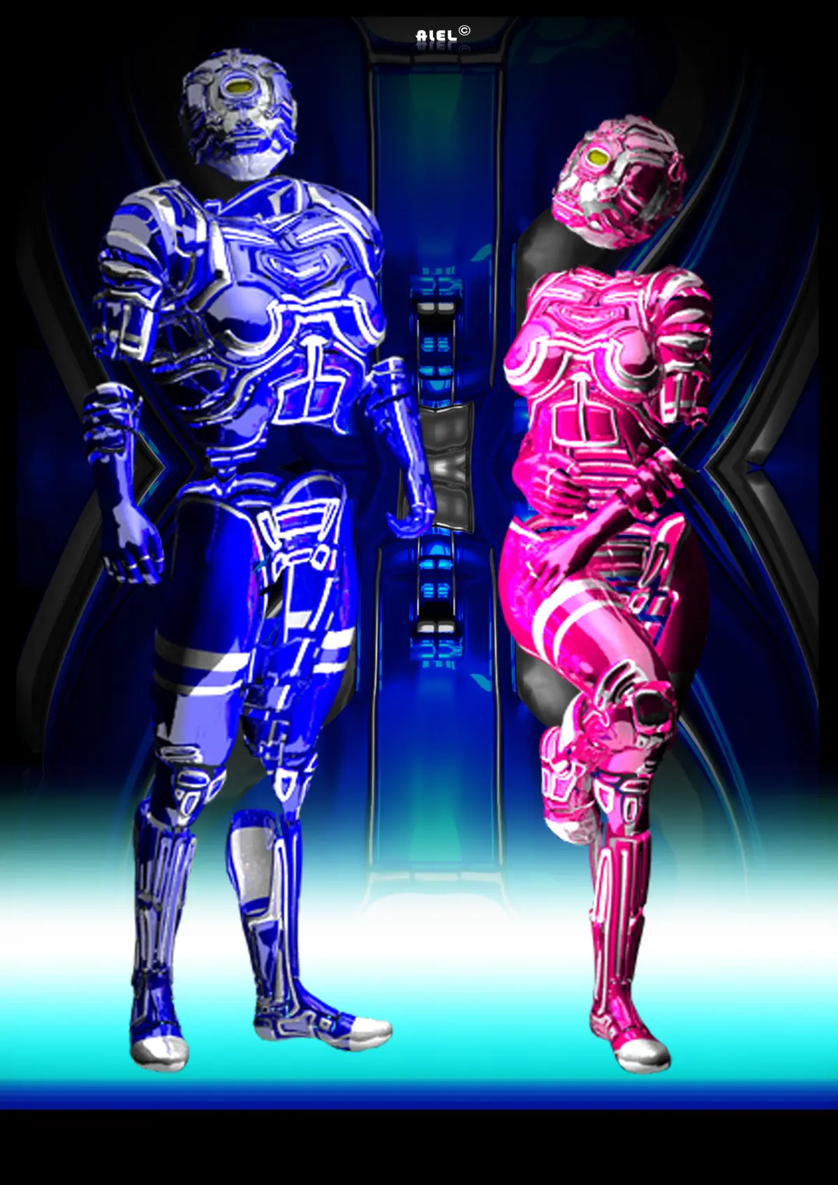 The picture with 2 models one blu and one pink that empty inside shows the obj models, the other renders are Genesis (human model) with the robot model used as clothes.
