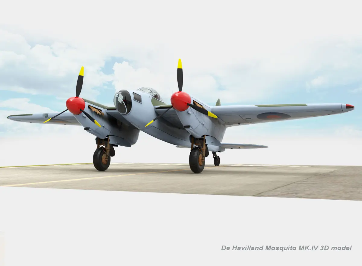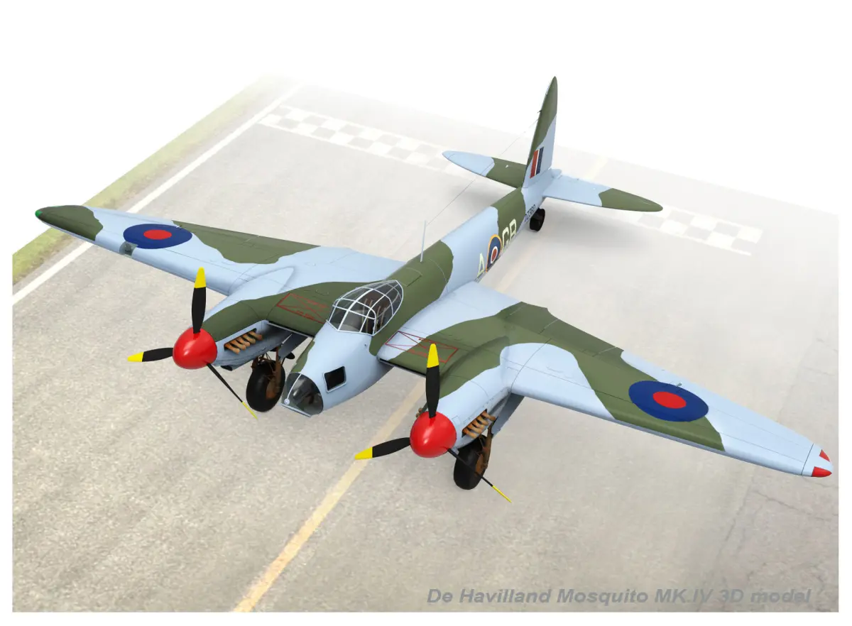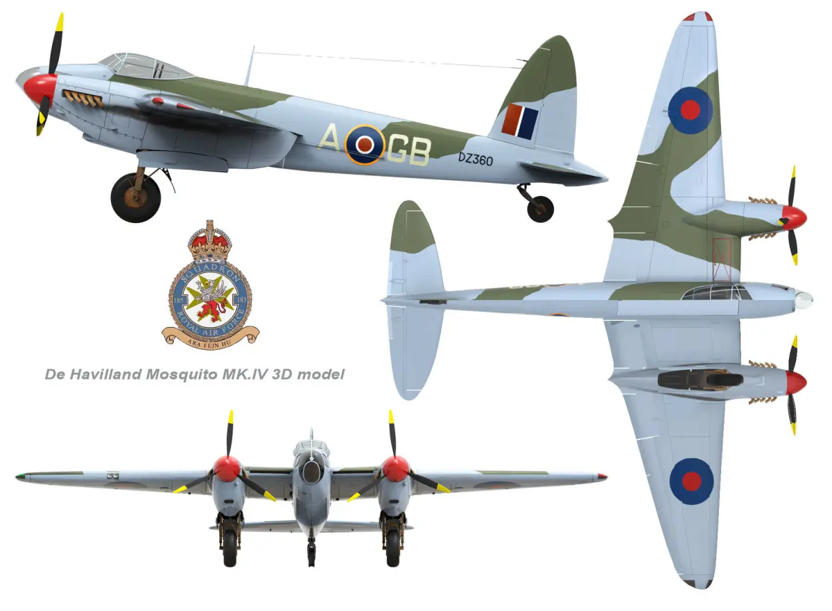 The 3d model was designed according to a real aircraft base: Mosquito MK.IV, DZ360, of No. 105 Squadrom, Horsham St. Faith and Marham 1943.