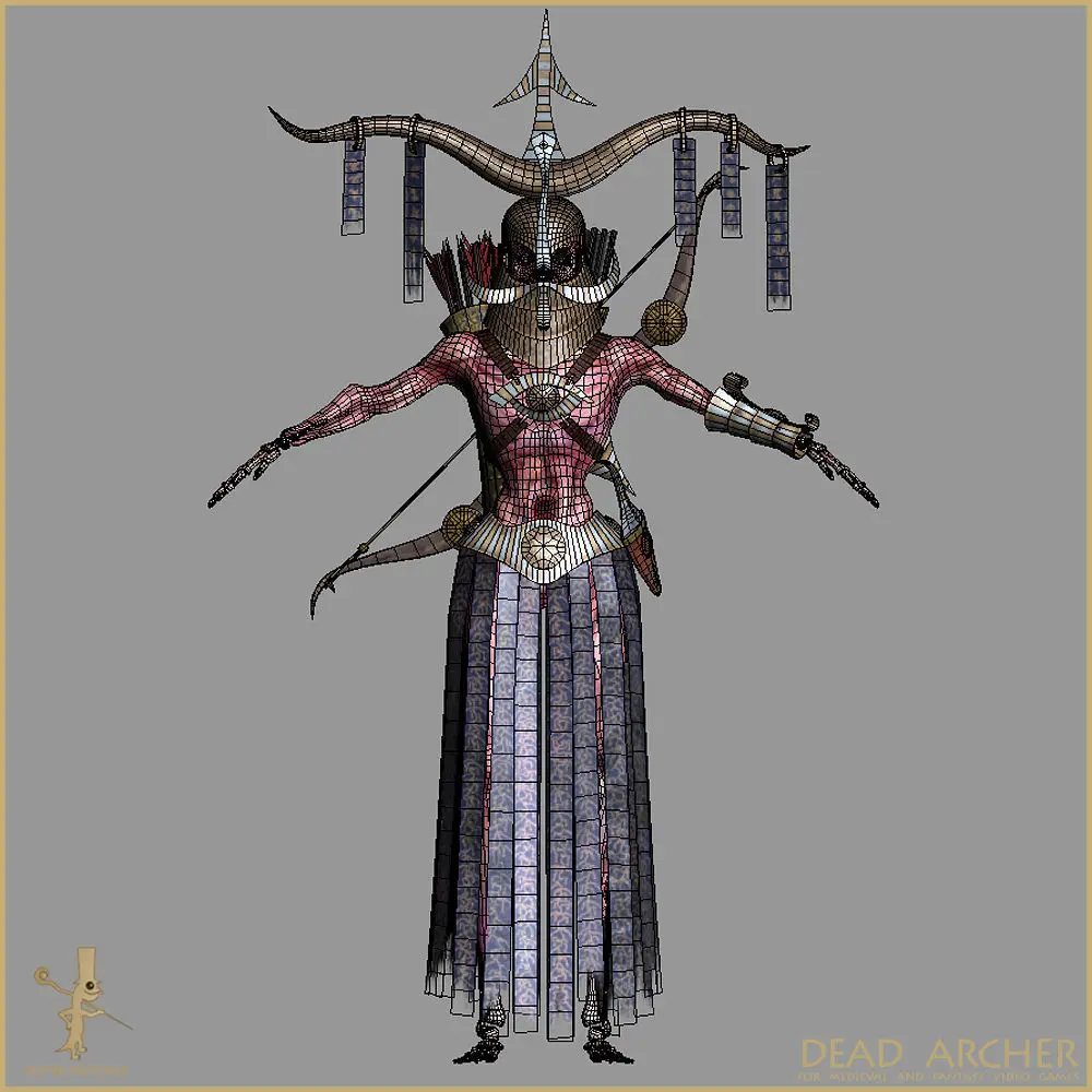 All parts are independent objects and can be removed or hided.Body parts 2: Body and HairArmor parts 9: Mask, Chest Armor, Hand Armor, Short Skirt, Long Skirt, Cloak, Belt(Cloak and Long Skirt are clothes simulated objects).Weapons: StaffCharacter and all parts have LOD versions.Model with all parts 29,217(10,193 LOD) polygons, 57,641 (19,603 LOD) triangles and 30,450 (11,013 LOD) vertexes.