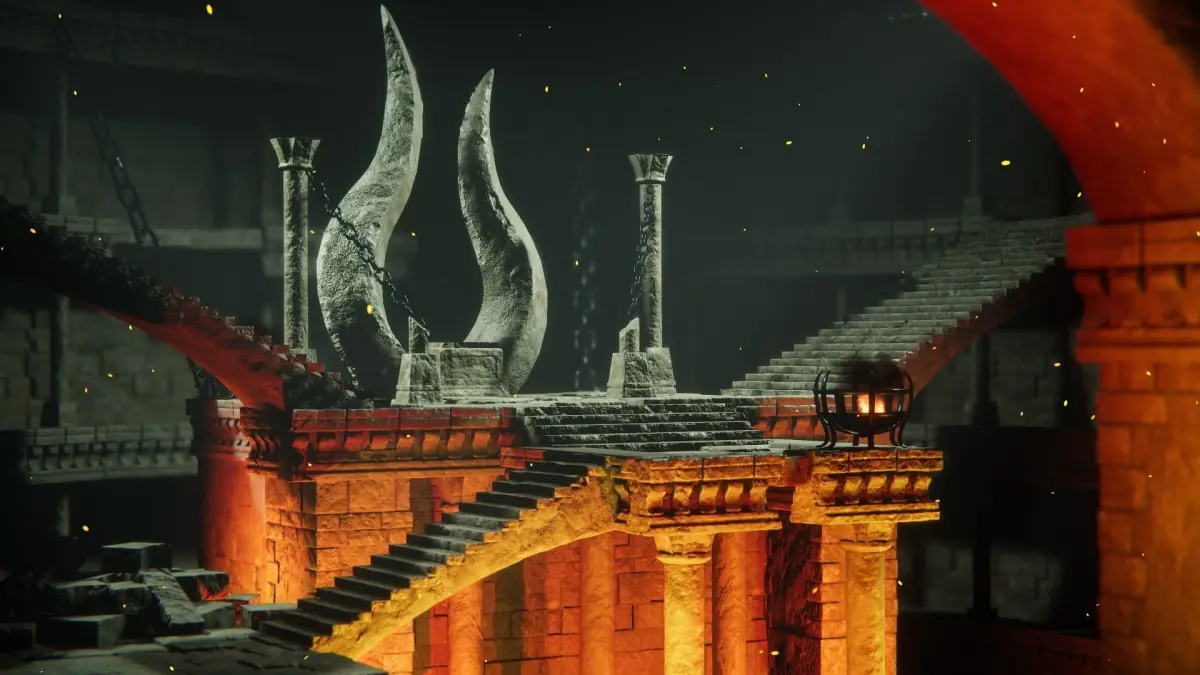 Symbols are great tools to tell a story with your scene. Chains are connected to captivity and slavery and awake the feeling of hopelessness and lack of freedom in the player. Horns are a symbol of strength, power, and supremacy. Humans believed that horned animals' strength was concentrated in their horns.