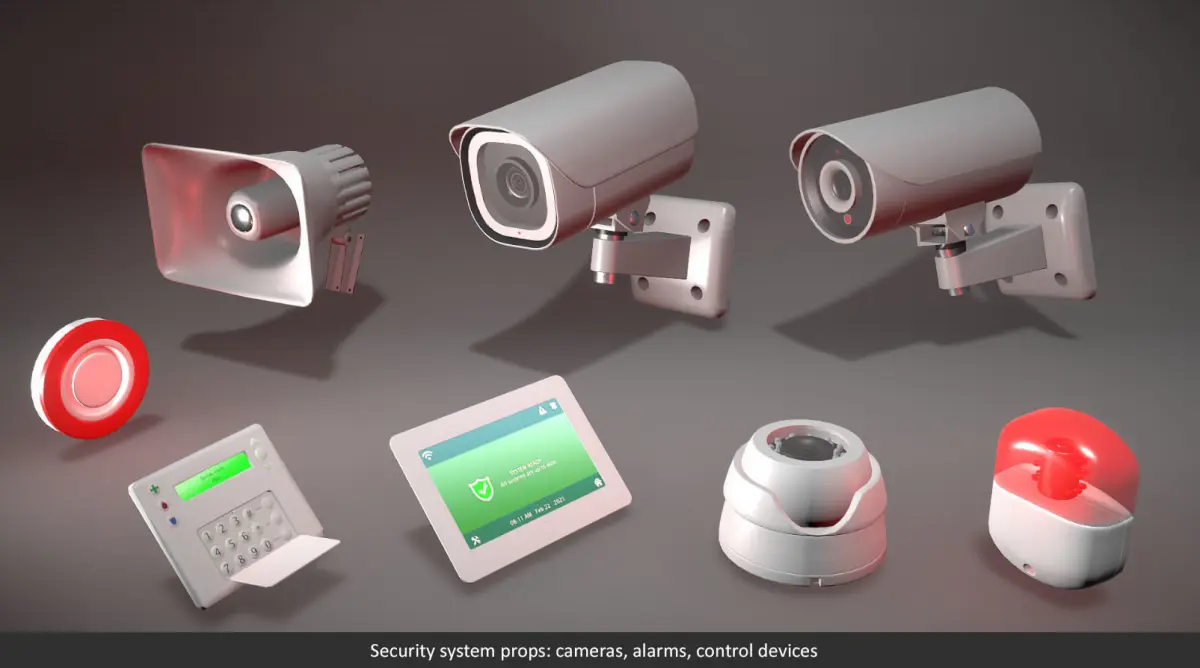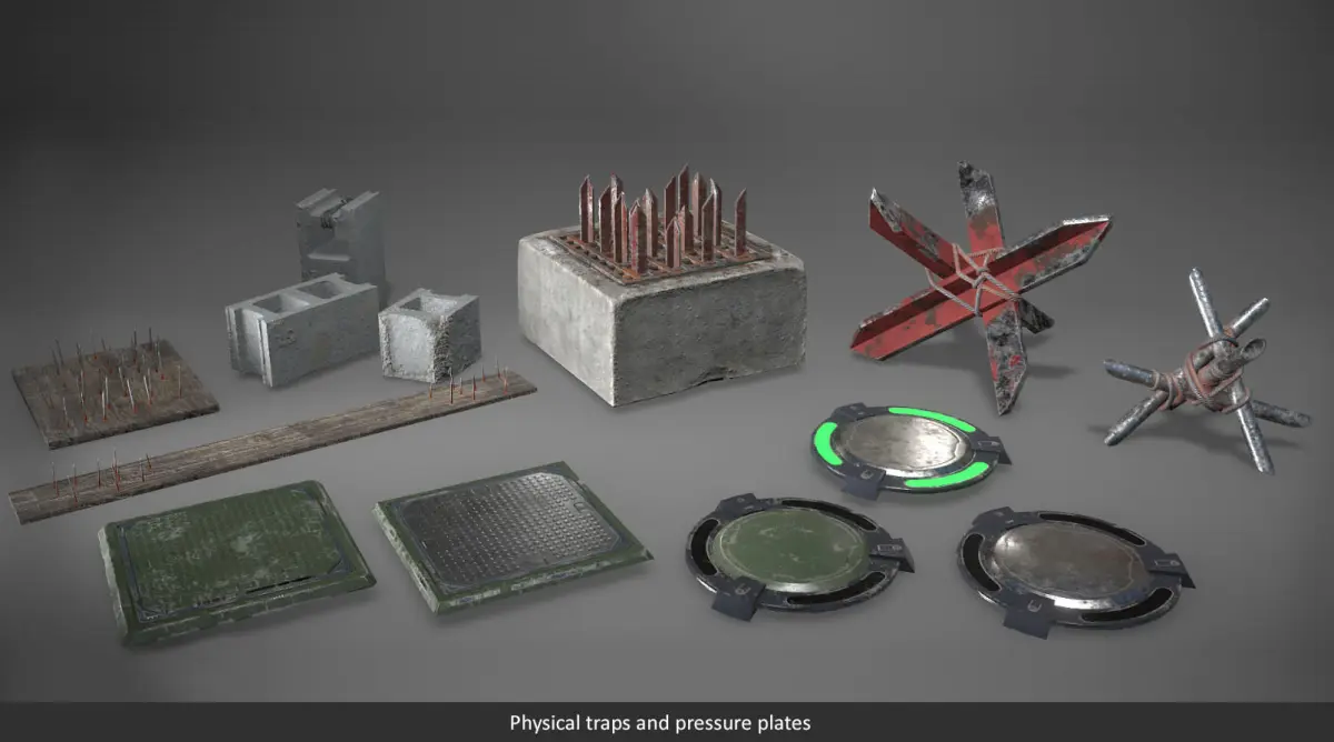 Prefabs without scripts38 Base traps and parts: 2 nail caltrops, 3 cinder blocks, 4 electric boxes with animation, 2 flame throwers, Tesla gun, landmine, laser trap, 2 nail boards, 4 pressure plates, robotic arm, 4 sawblade trap variations, 3 scythe trap variations, 3 trap slot variations, spike trap, 2 falling traps, 3 swinging traps10 security props: 3 cameras, 2 alarms, airhorn, touchpad, control panel, motion sensor, occupancy sensor23 Tools and valuables: 2 dollar bill stacks, credit card, 3 jewelry, wall safe with opening animation, Russian and USA passports, smartphone, USB key, screwdriver, wire cutter, 2 pocket knives, EMP generator, signal jammer, fish hook, pocket mirror, 2 tripwire triggers