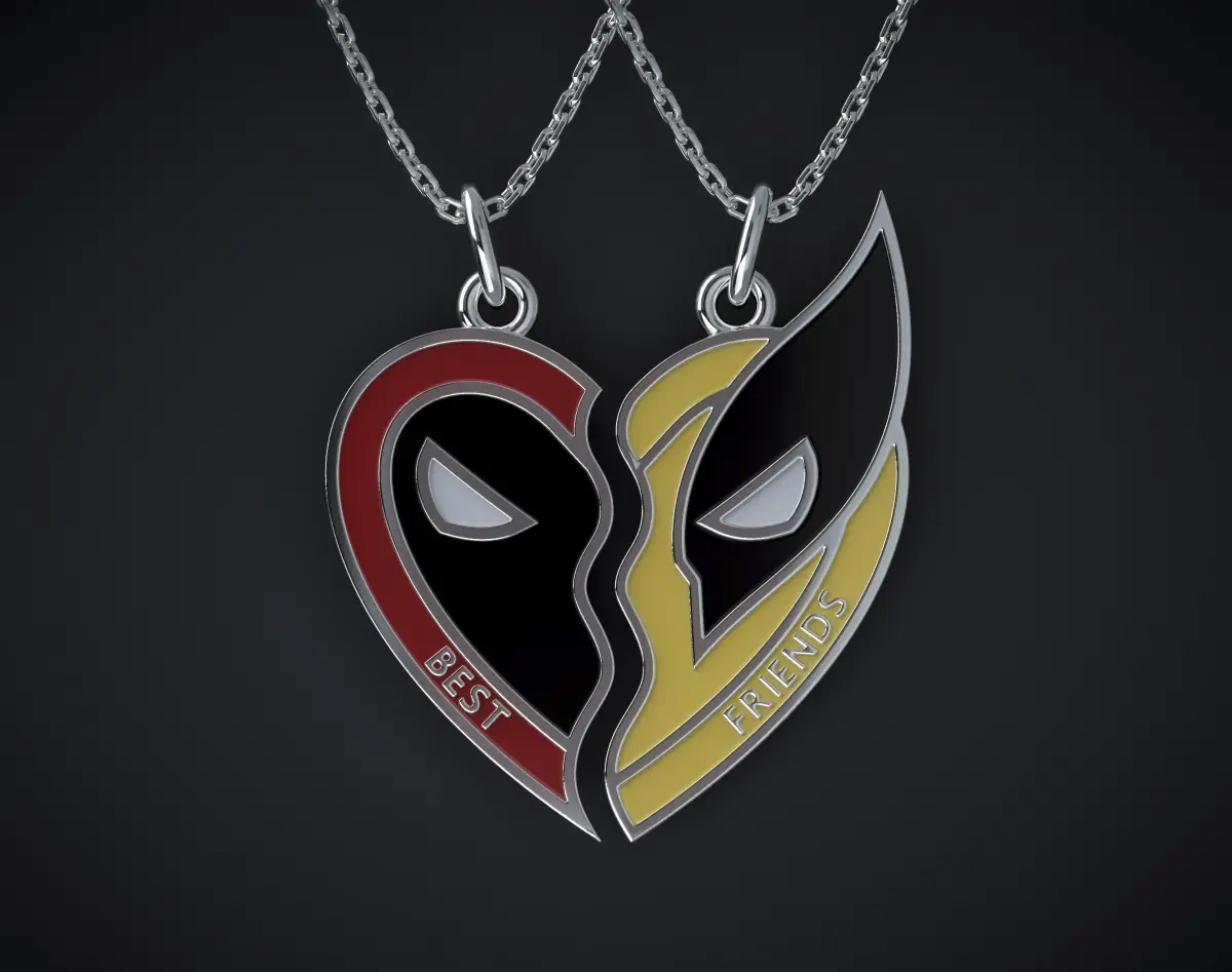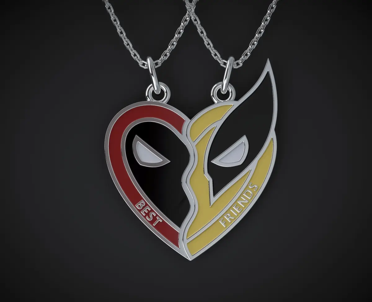 The pendant BEST FRIENDS, featuring the comic book characters Deadpool and Wolverine, is a great gift for fans of the Marvel Cinematic Universe and Marvel Comics.