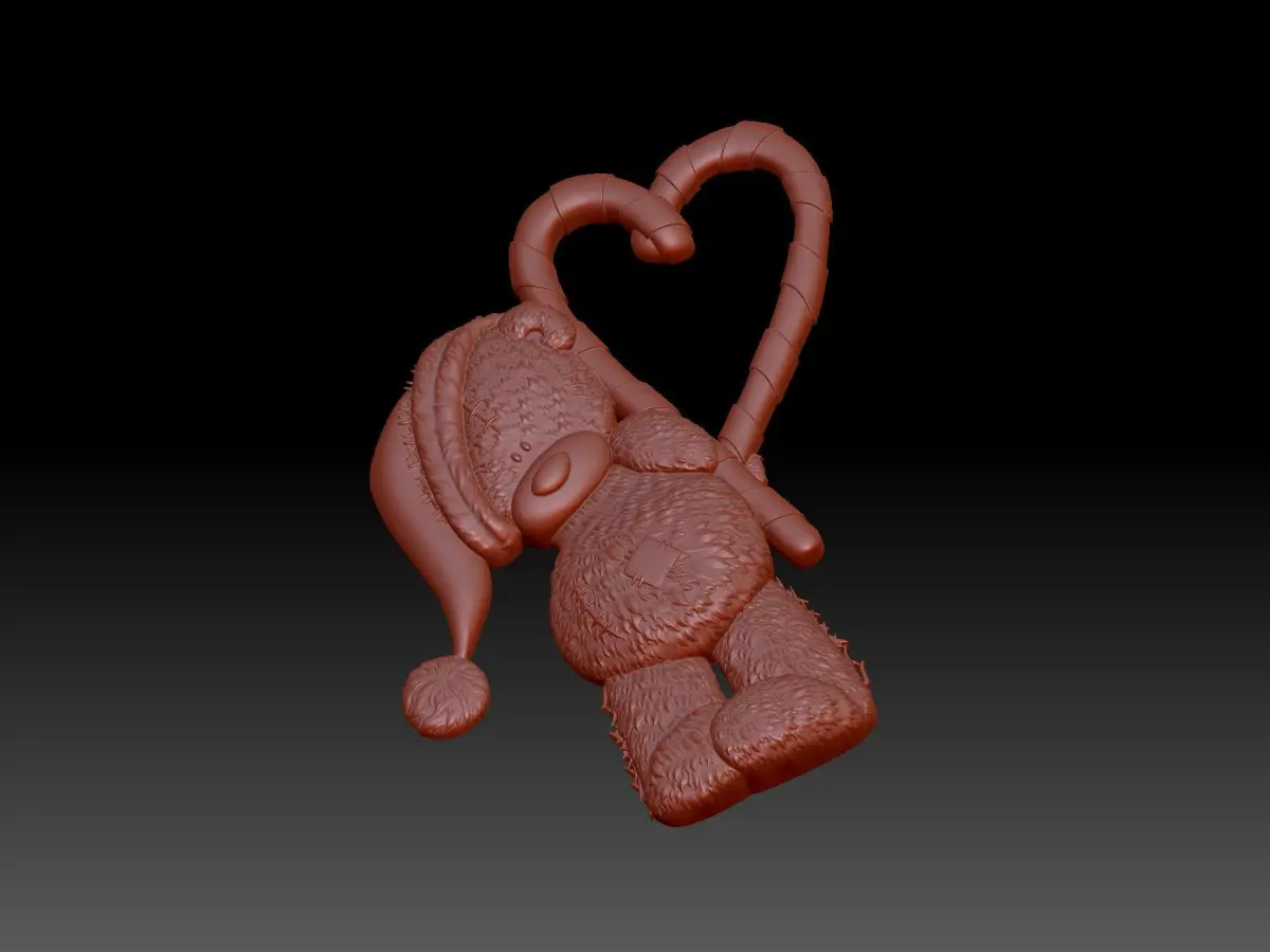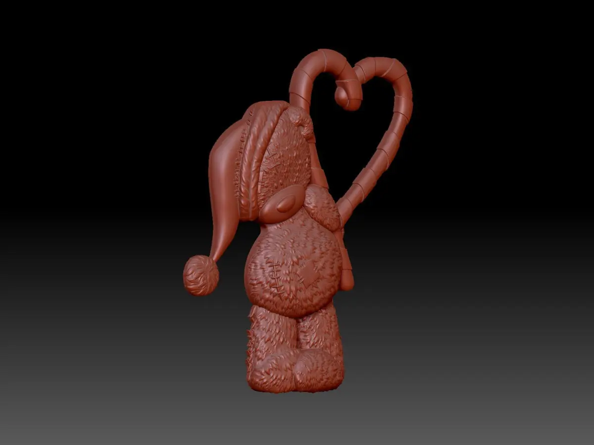 A 3D model called Cute Teddy Bear. This cute and charming work depicts a shy teddy bear, who stands with his head down and slightly embarrassed. Behind his back, you can see a stick shaped like a heart. This is a job that will be an excellent choice for 3D printing and CNC machining.
