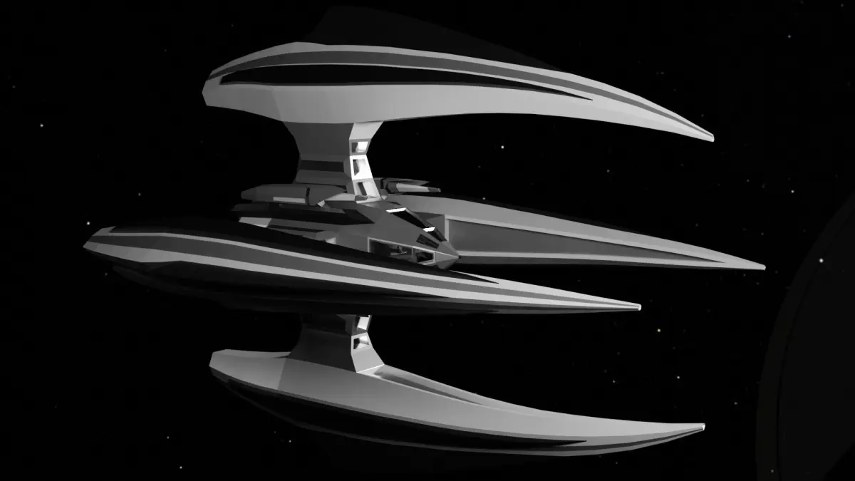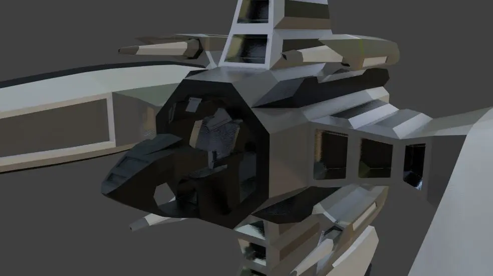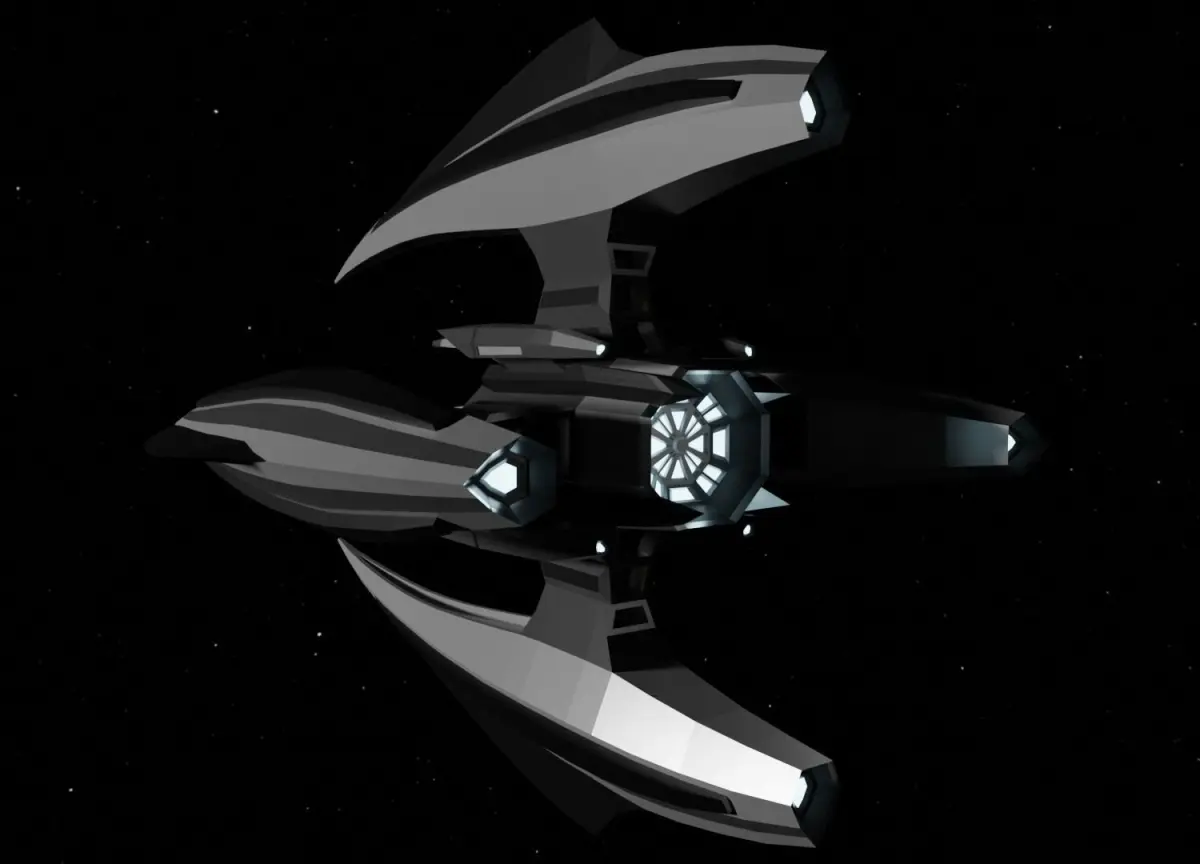 Design of the model is not based on any existing ideas and it was made from scratch using imagination of the author. The spaceship is designed to be classified as the fighter type of spaceship. Propulsion of the spaceship is provided by the one main hyperdrive engine and for auxilary jet engines. The armament of the spaceship are 4 conventional ammo guns, 4 ion cannons placed on the tips of the arms and four force field generators. Model contain simple cockpit design so if it is needed it can be visible from the outside.