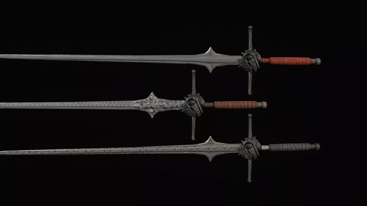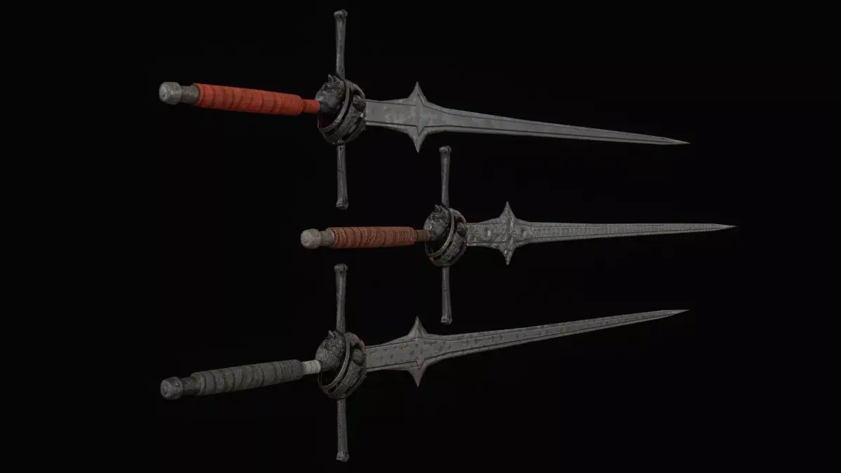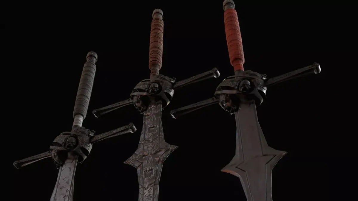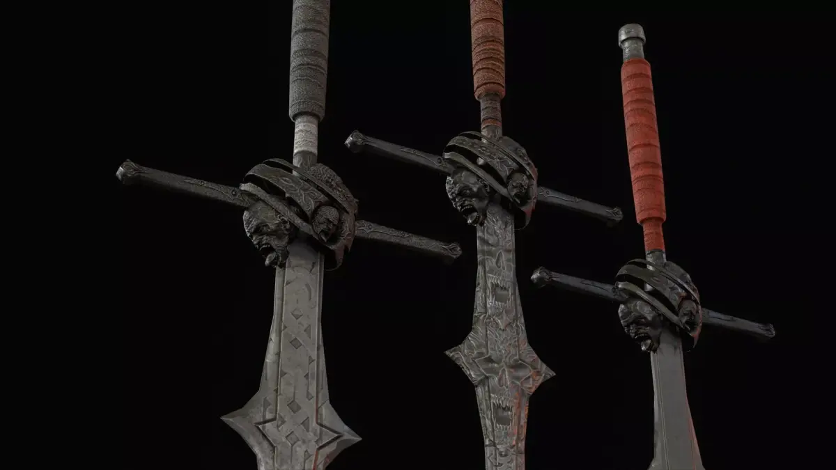 The design features a long blade with a classic crossguard, emphasizing its knightly origin while adding a dark and intimidating presence. The model includes PBR textures and is prepared for easy integration into game engines. The grip is positioned at world zero for convenient placement and attachment, and the model is oriented along the Z axis. The asset includes 2K and 4K textures, making it suitable for optimized real-time use as well as more detailed cinematic scenes.