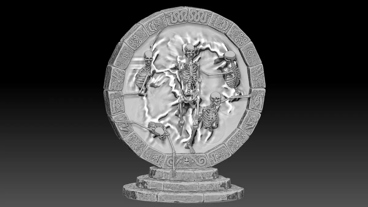 Death portal with exiting skeletons. There is also high poly version STL files for 3d printing. There is separated (portal top and bottom, two stairs parts, vortex force and five skeletons) and whole version of stl files. Also there is additional portals (3) and vortex forces (4) for 3d printing if you want to change and mix them (look at the last picture).