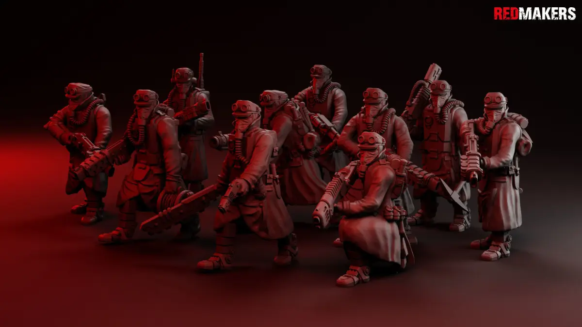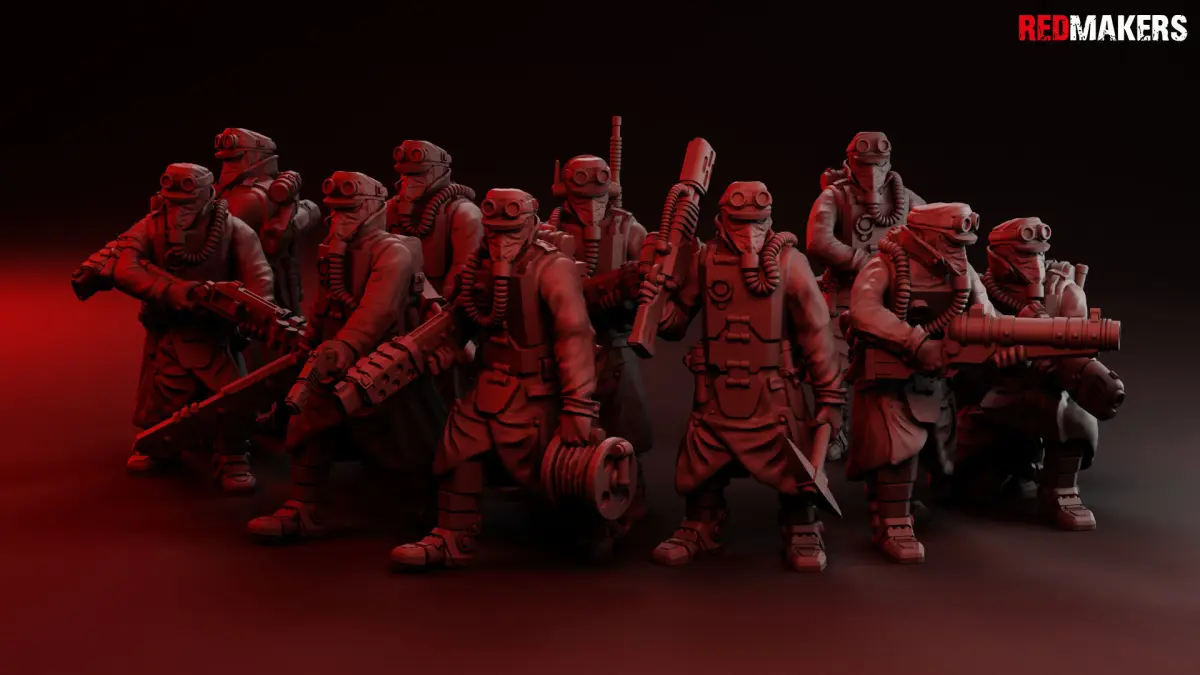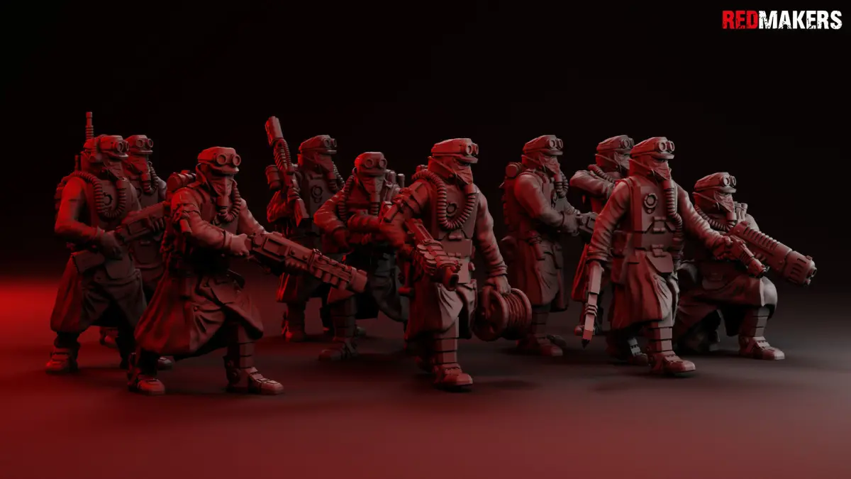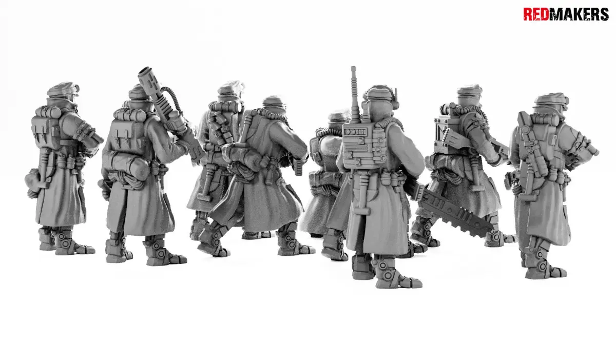 The squad of engineers consists of 10 unique positions: 1 commander, 1 radio operator, 8 engineers. The radio operator and engineers have 5 types of weapons. Scaled for 28 mm tabletop.