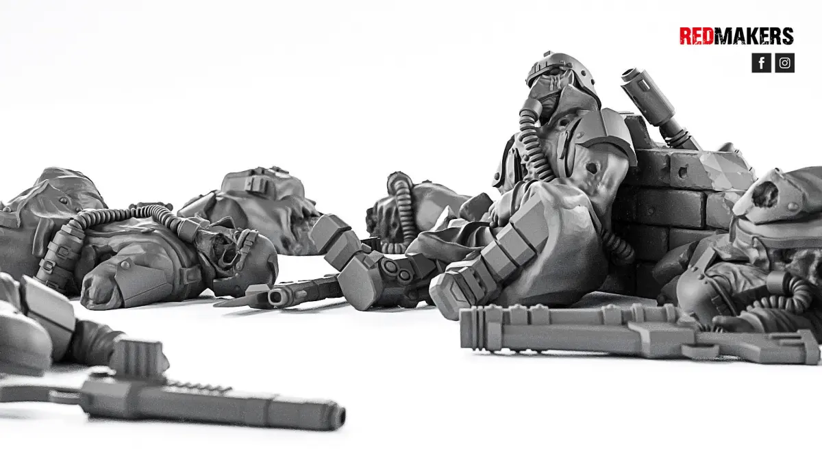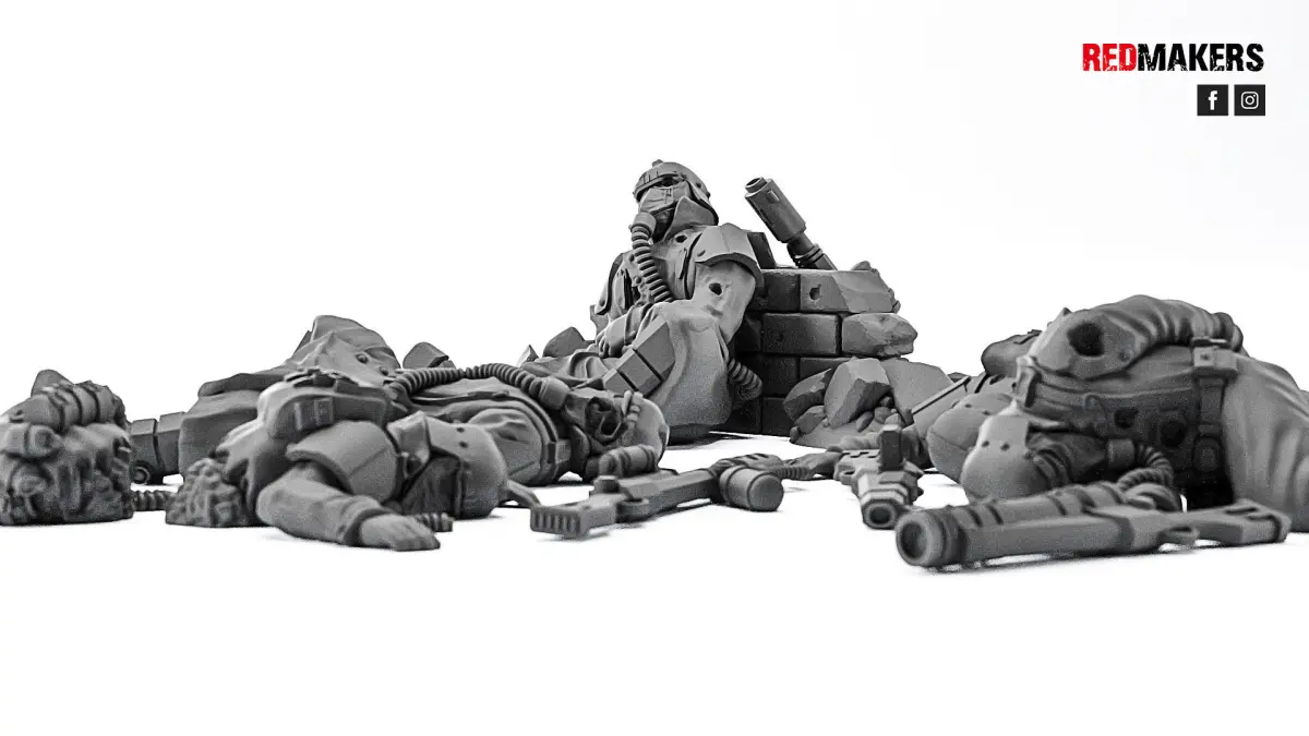 The pack consists of five killed death squad soldiers. The wall is a separate model and may not be used. Scaled for 28 mm tabletop.