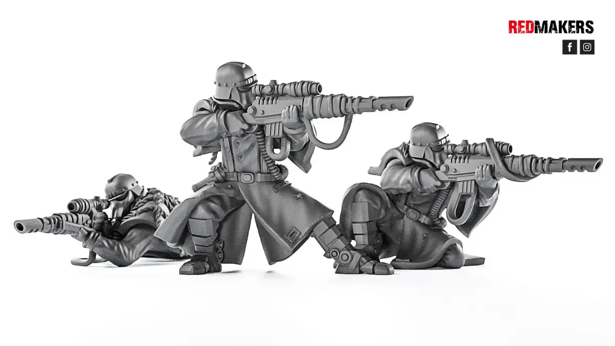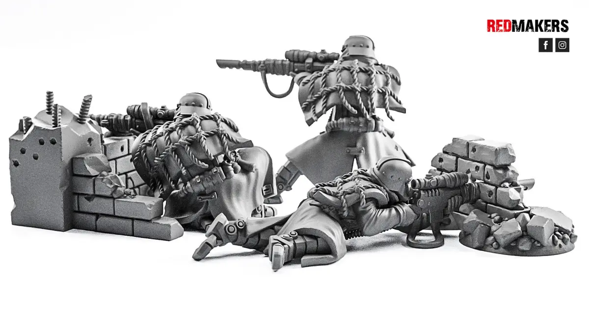 The pack consists of three death squad snipers and two walls. Walls are separate models and may not be used. Scaled for 28 mm tabletop.