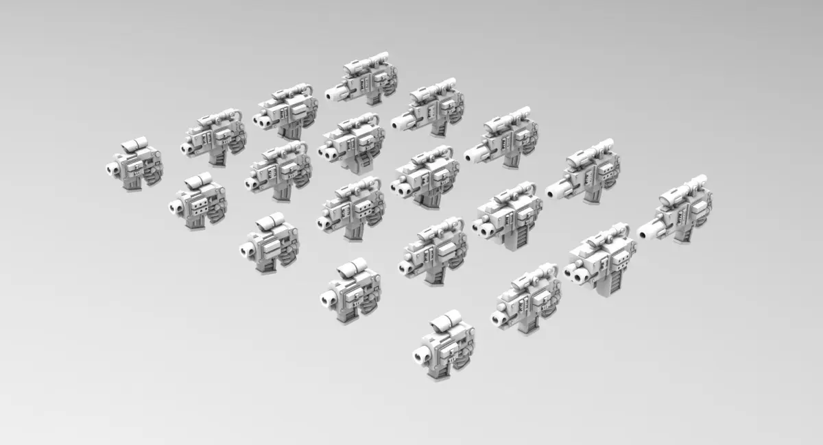 All Weapons except Stalkers Bolters have Left-Handed and Right-Handed Versions. 35 Weapons in total!