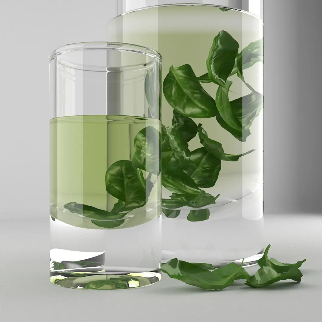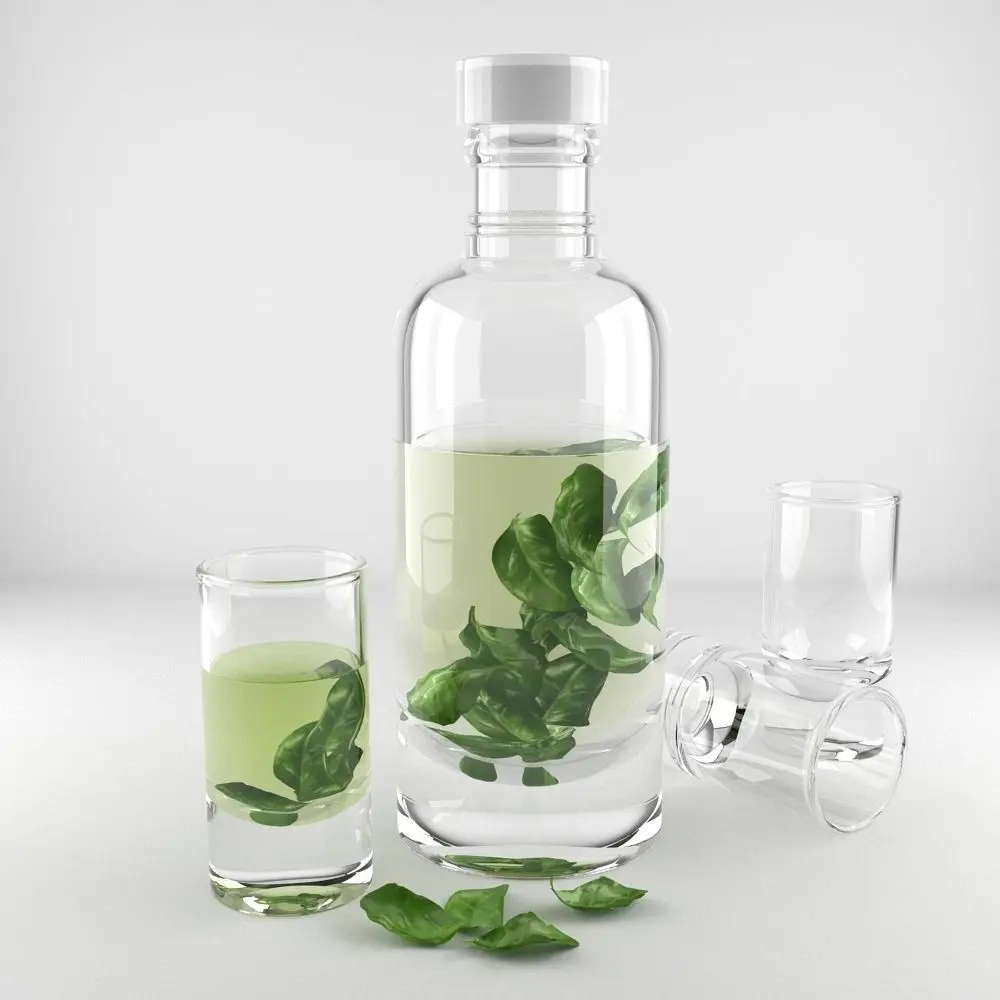 A DETAILED 3D MODEL OF A DECANTER AND SHOT GLASS SET;