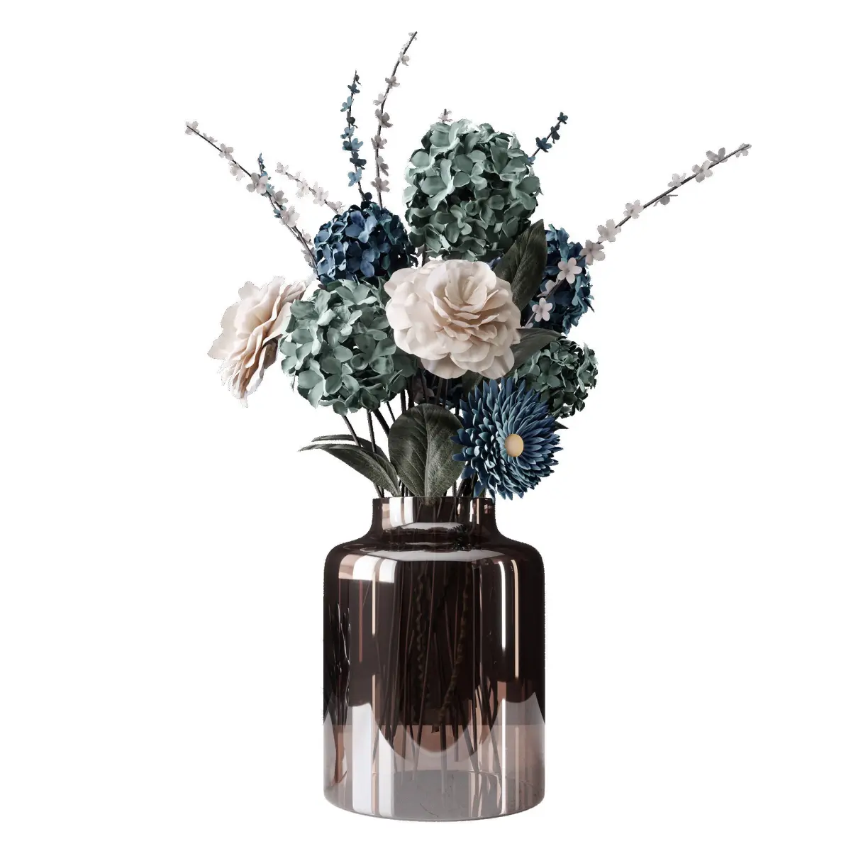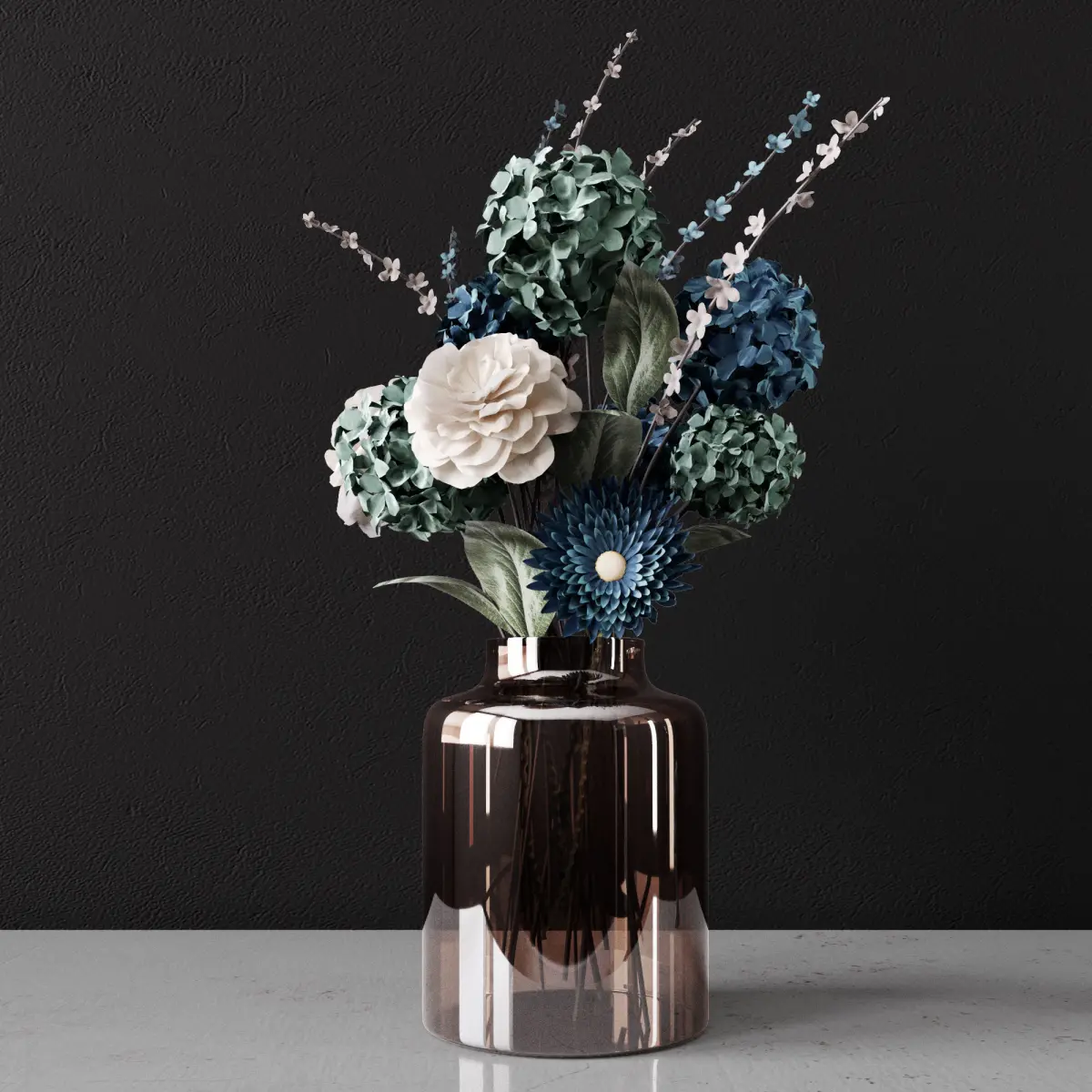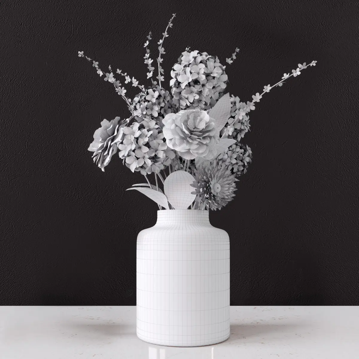 A photorealistic model of a delicate decorative bouquet of flowers in a vase Victoria.
