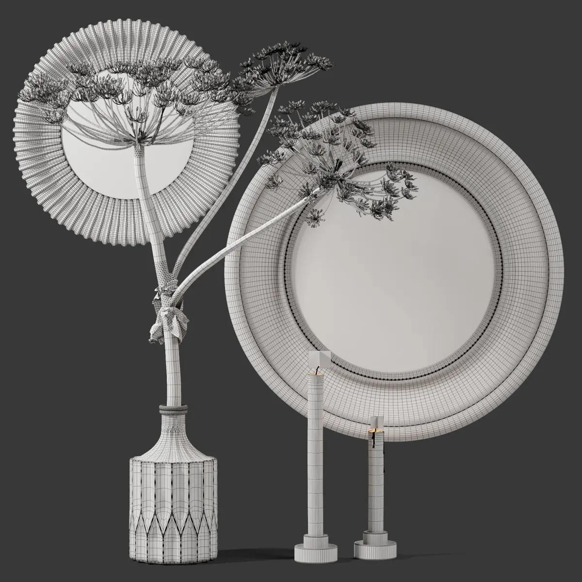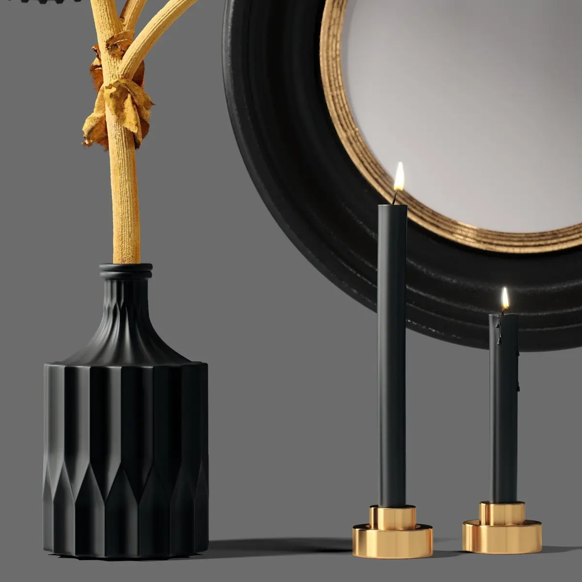 This 3d model Decor Set 8 Branch in a vase, candles and mirrors are fully textured, detailed design that allows for close-up realistic renders.
