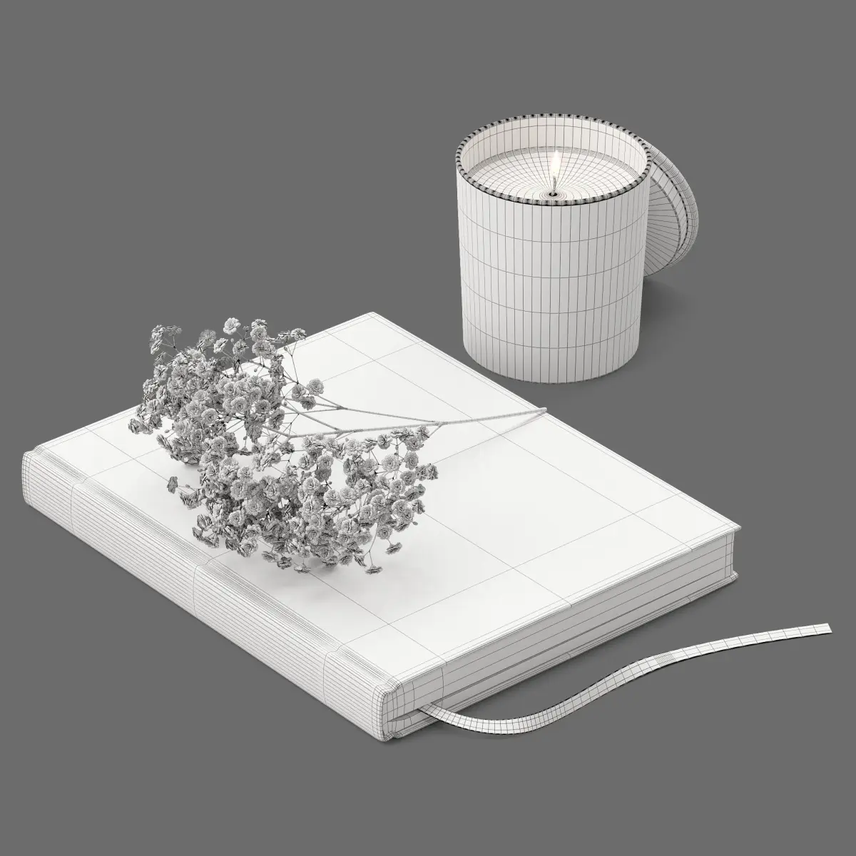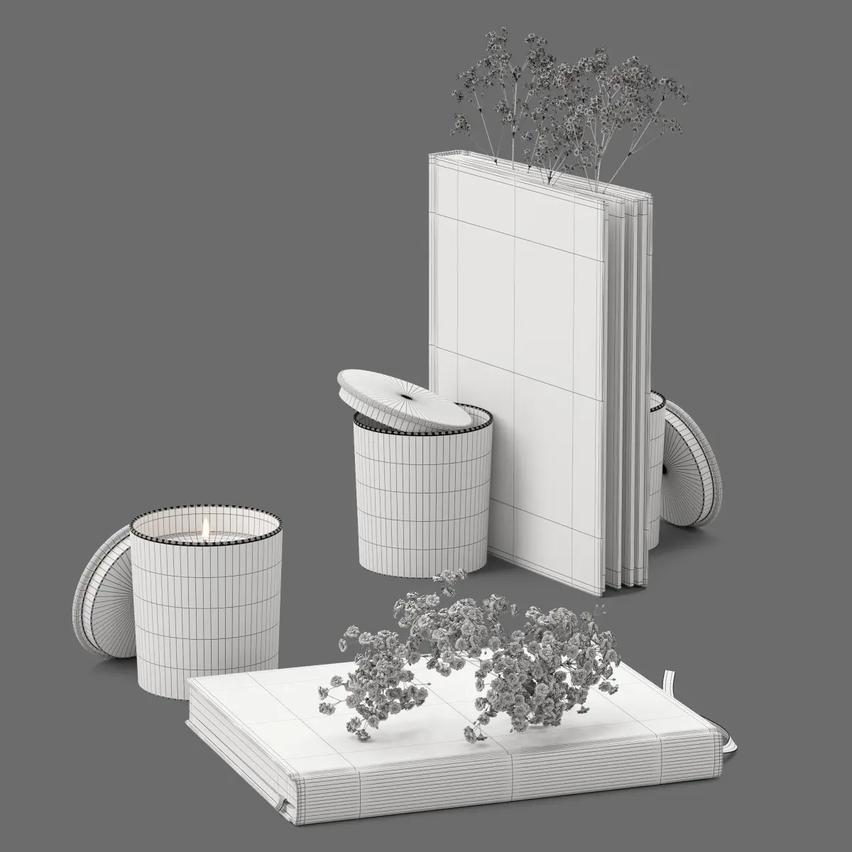 *This 3d model Decor Set 45 Gypsophila, candles and books has fully textured, detailed design that allows for close-up realistic renders. *