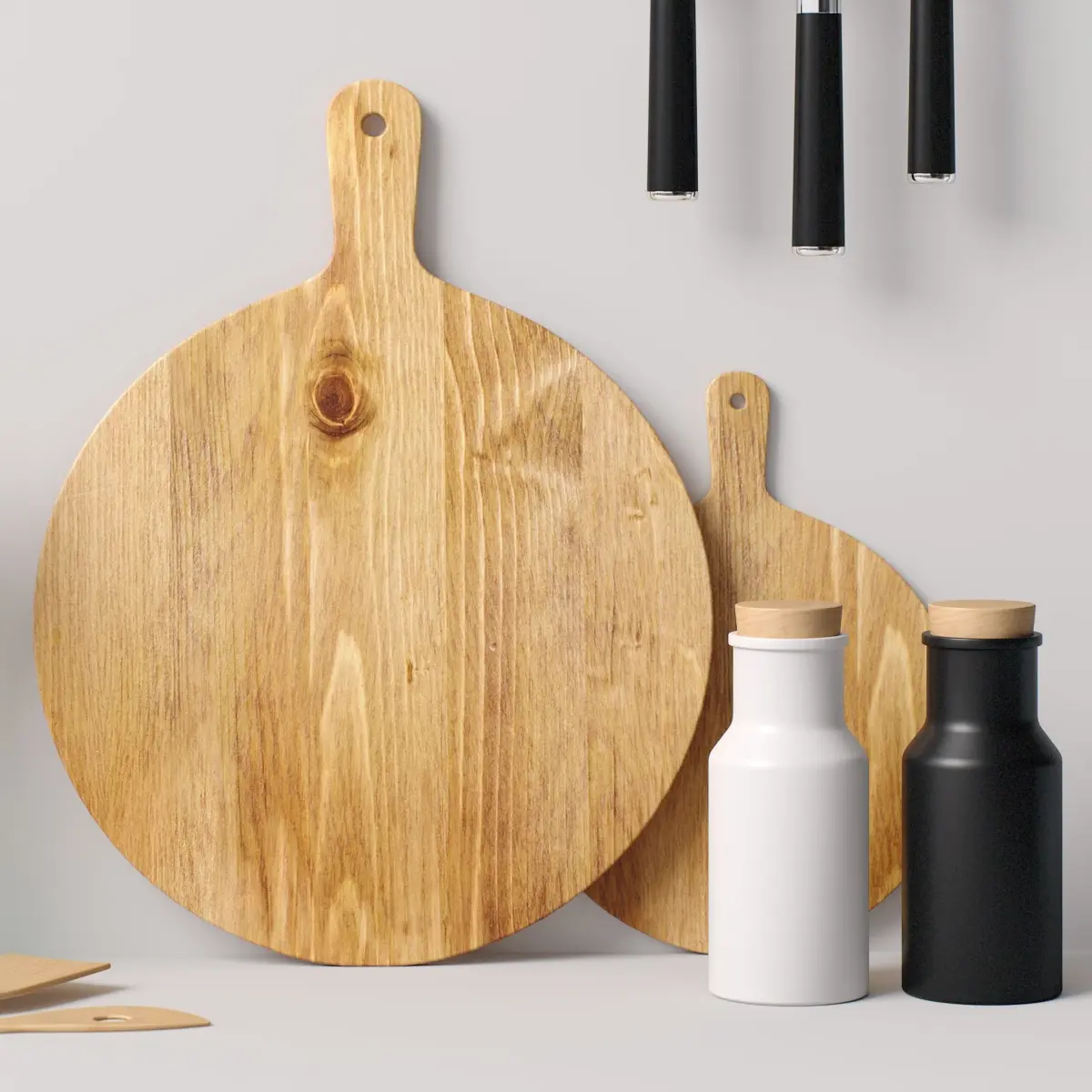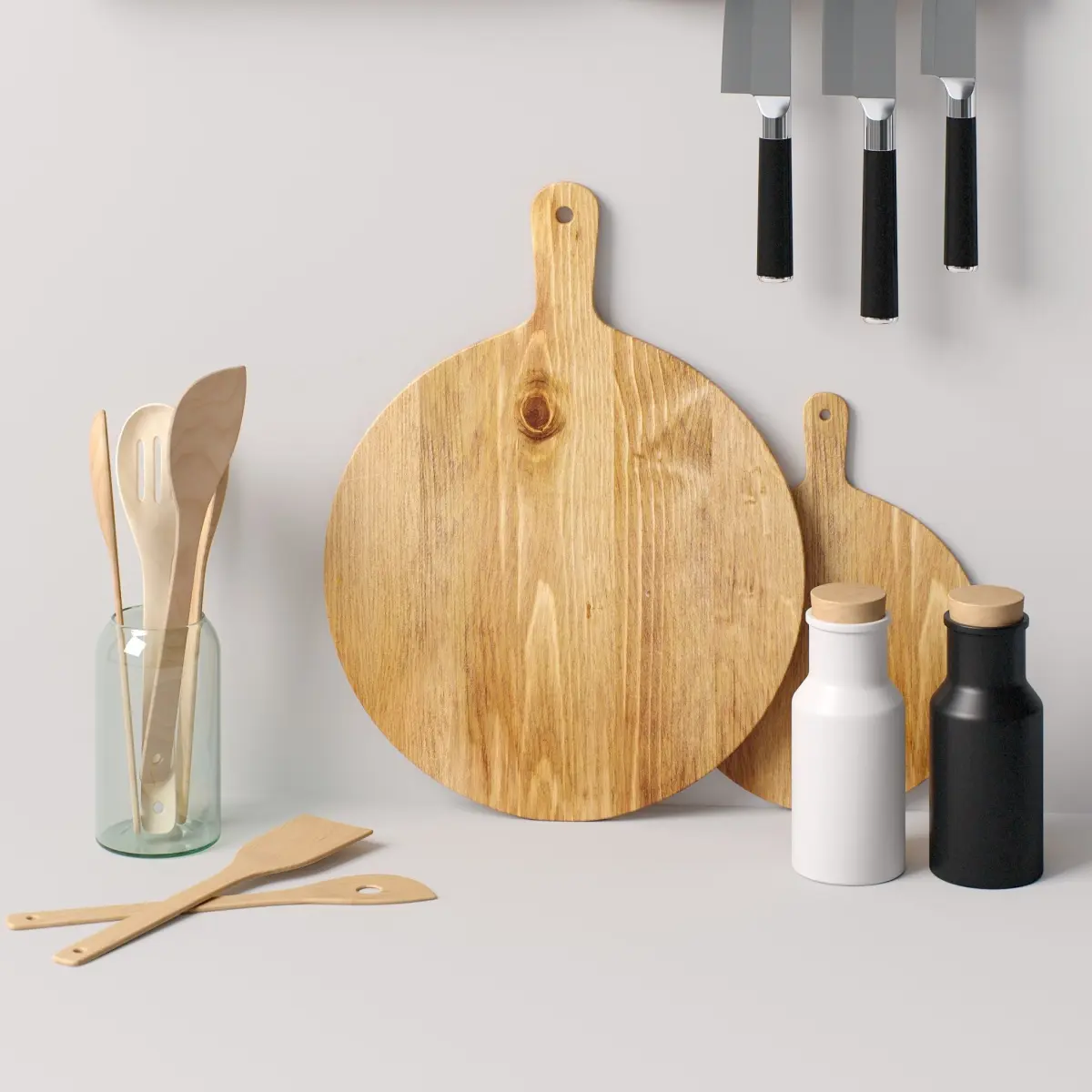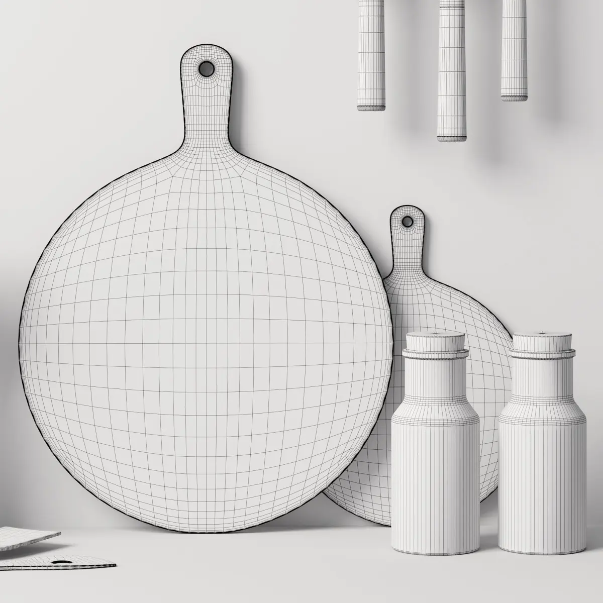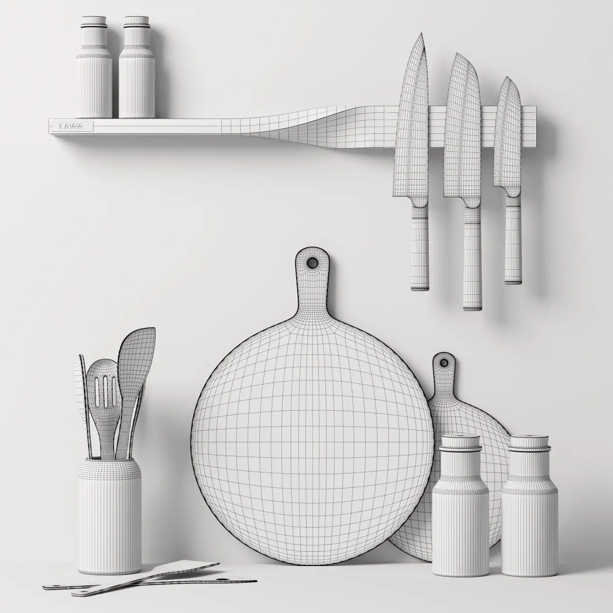 *This 3d model Decor Set 91 Twisted shelf, kitchen boards, spice jars, knives and spatulas in a vase has fully textured, detailed design that allows for close-up realistic renders. *