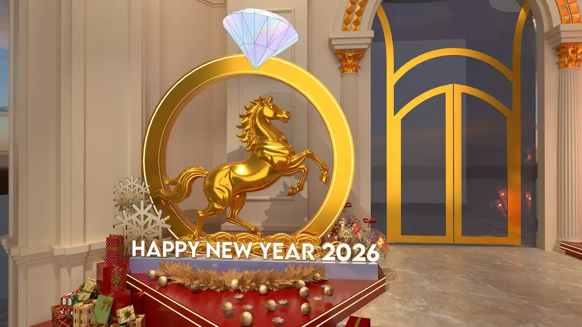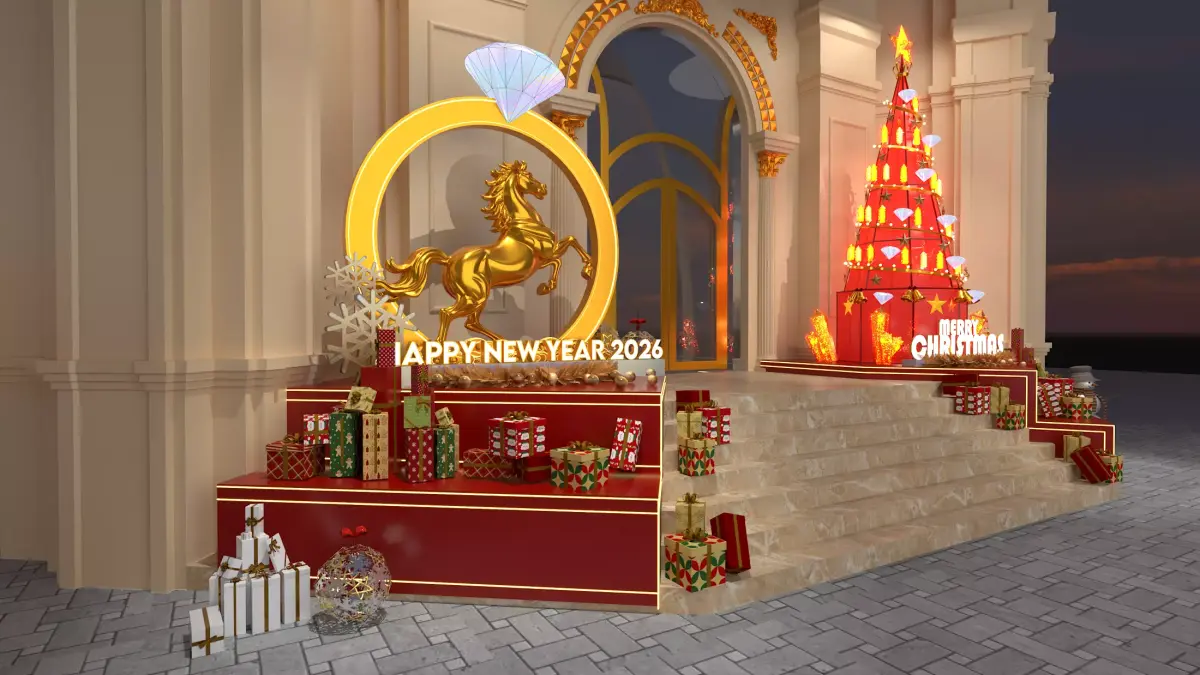 English Summary: Luxurious Festive Event DesignThis is a design for a grand event backdrop or entryway, blending themes of Christmas (Merry Christmas) and New Year's Eve/Lunar New Year (Happy New Year 2026) into a single, luxurious, and opulent setting.